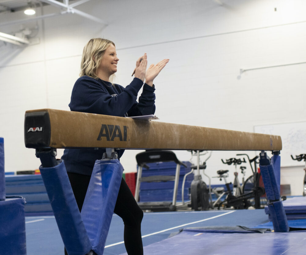 USU Gymnastics coach Kristen White cheers on the team during their practice on Thursday, Nov. 10. (Photo/Bailey Rigby)