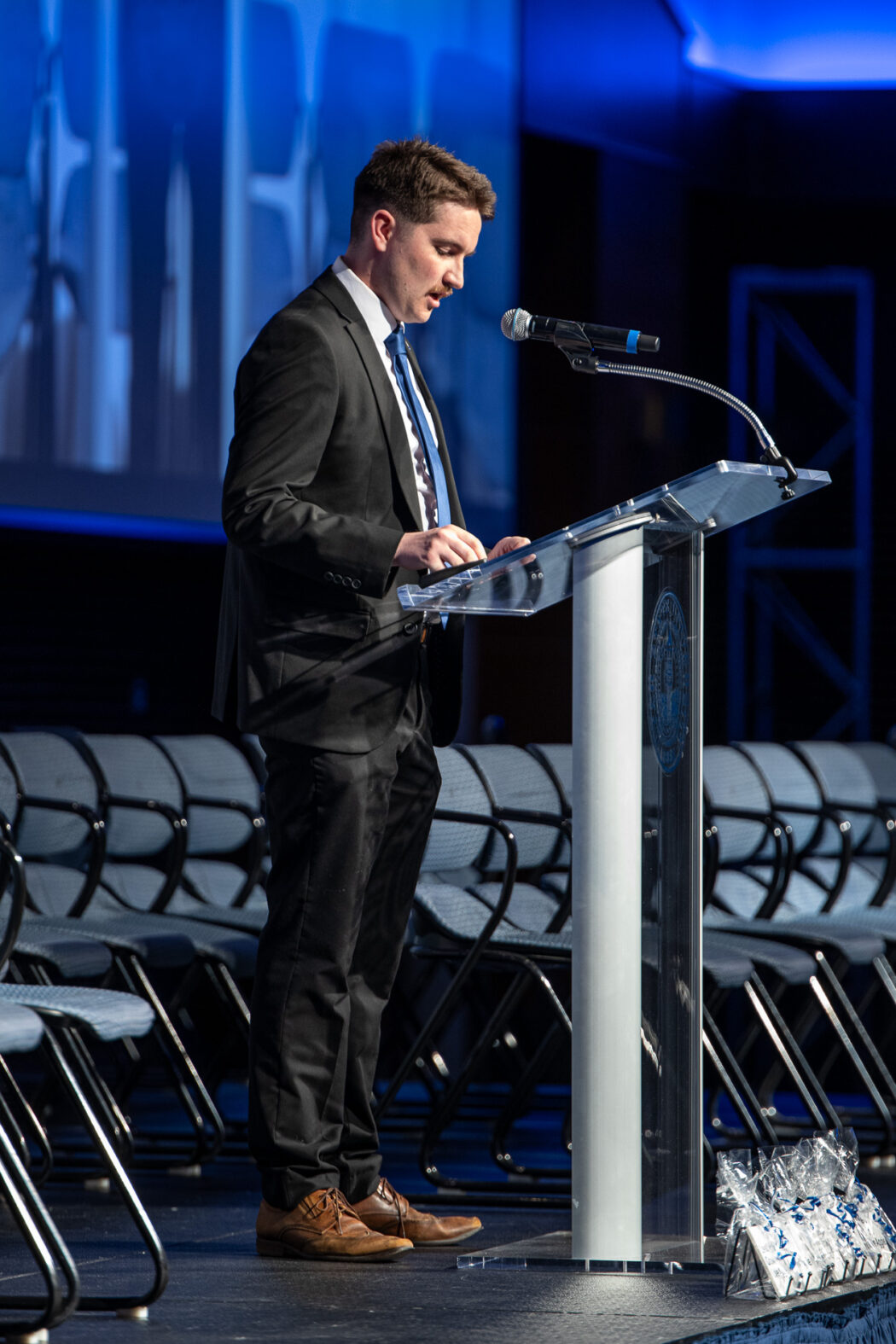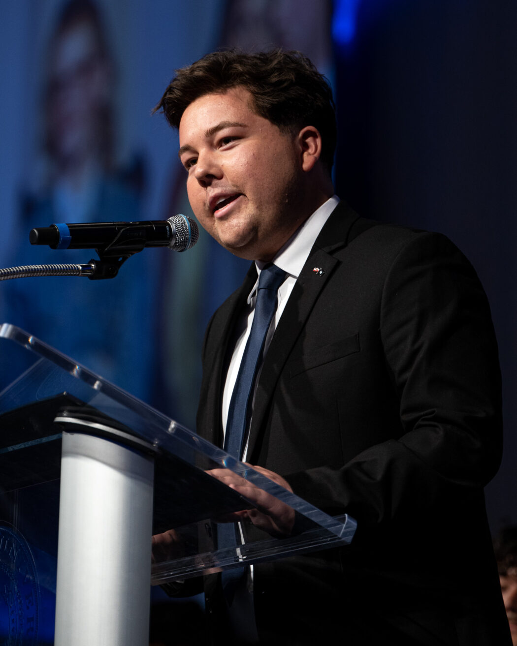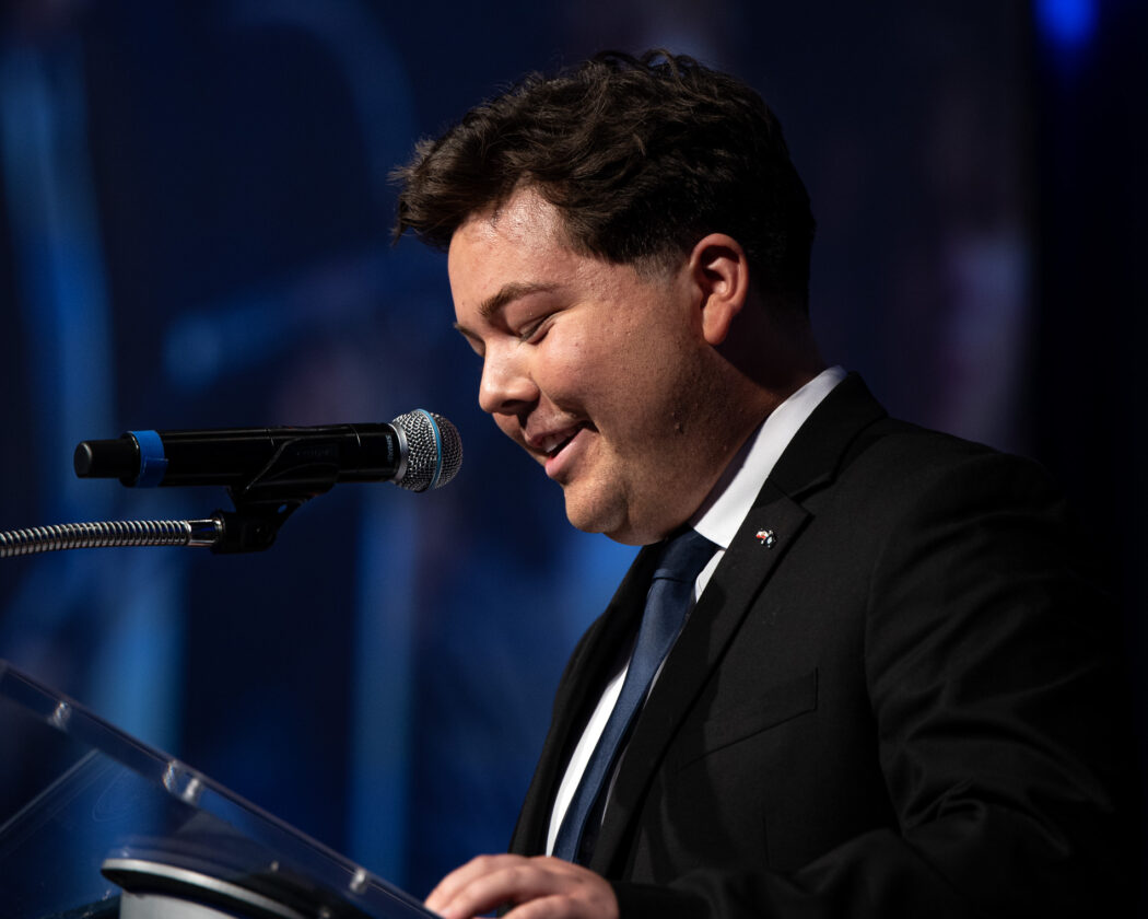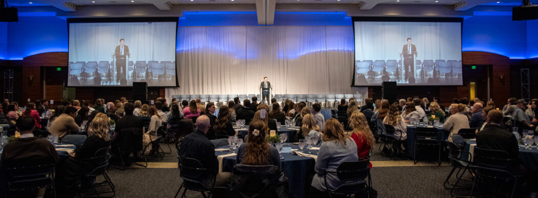 Newly inaugurated USUSA President, Brandon Sorensen speaks after swearing in the incoming USUSA officers at the 2025 USUSA Inauguration on April 18 in the TSC Ballroom.