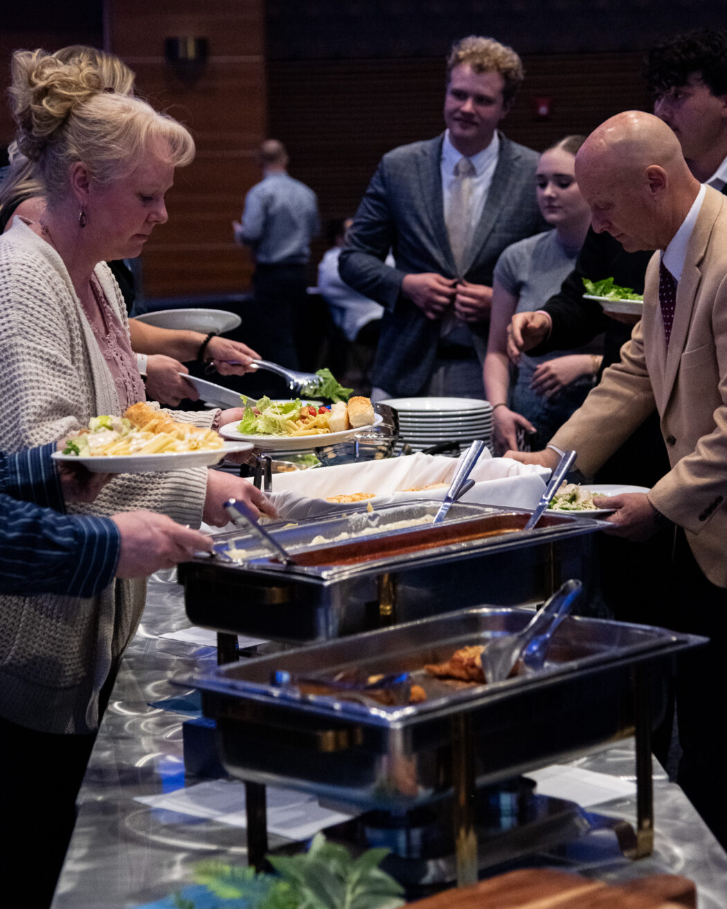 Attendees fill their plates with food at the 2025 USUSA Inauguration on April 18 in the TSC Ballroom.