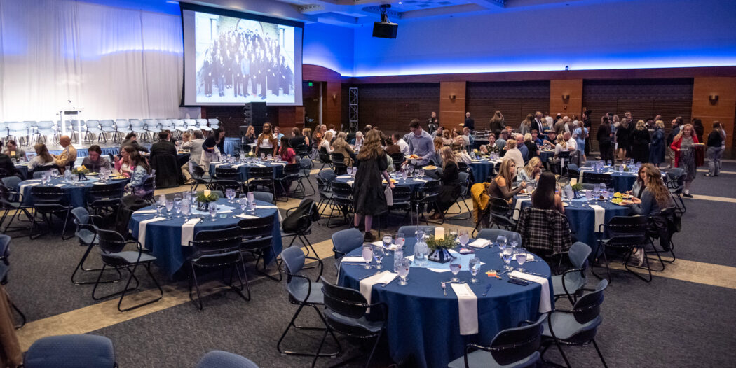 Attendees eat and talk after the 2025 USUSA Inauguration on April 18 in the TSC Ballroom.