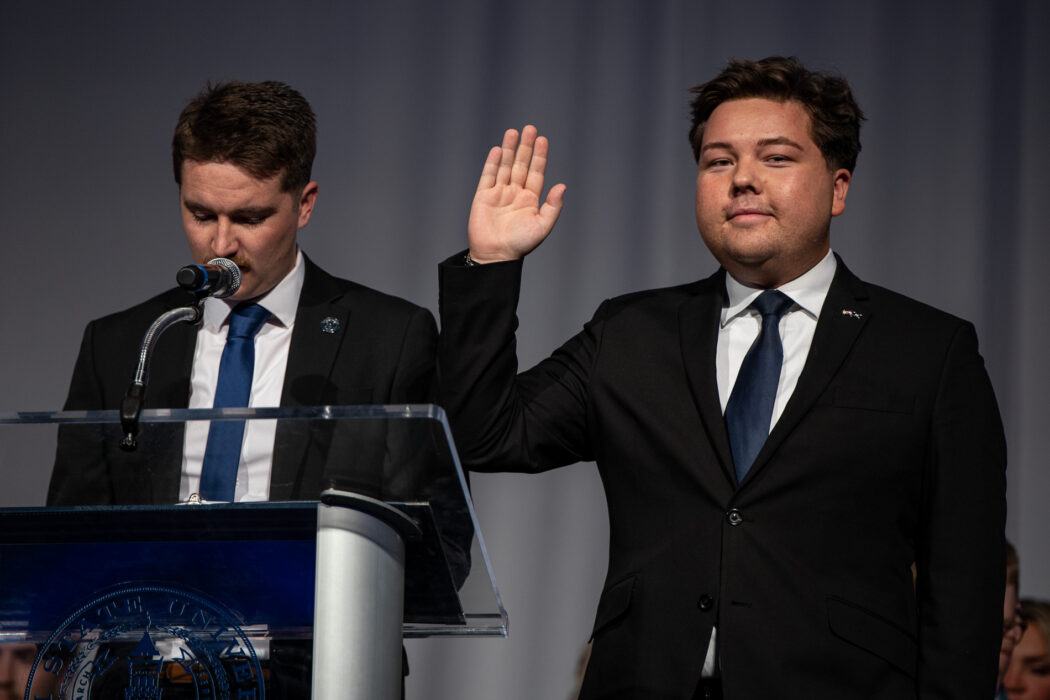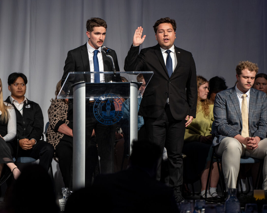 USUSA President Mathew Richey, left, swears in newly inaugurated President Brandon Sorensen at the 2025 USUSA Inauguration on April 18 in the TSC Ballroom.