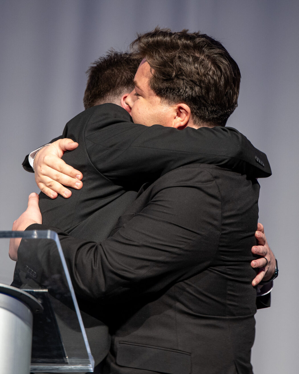 Mathew Richey, left, hugs the newly inaugurated president, Brandon Sorensen, at the 2025 USUSA Inauguration on April 18 in the TSC Ballroom.