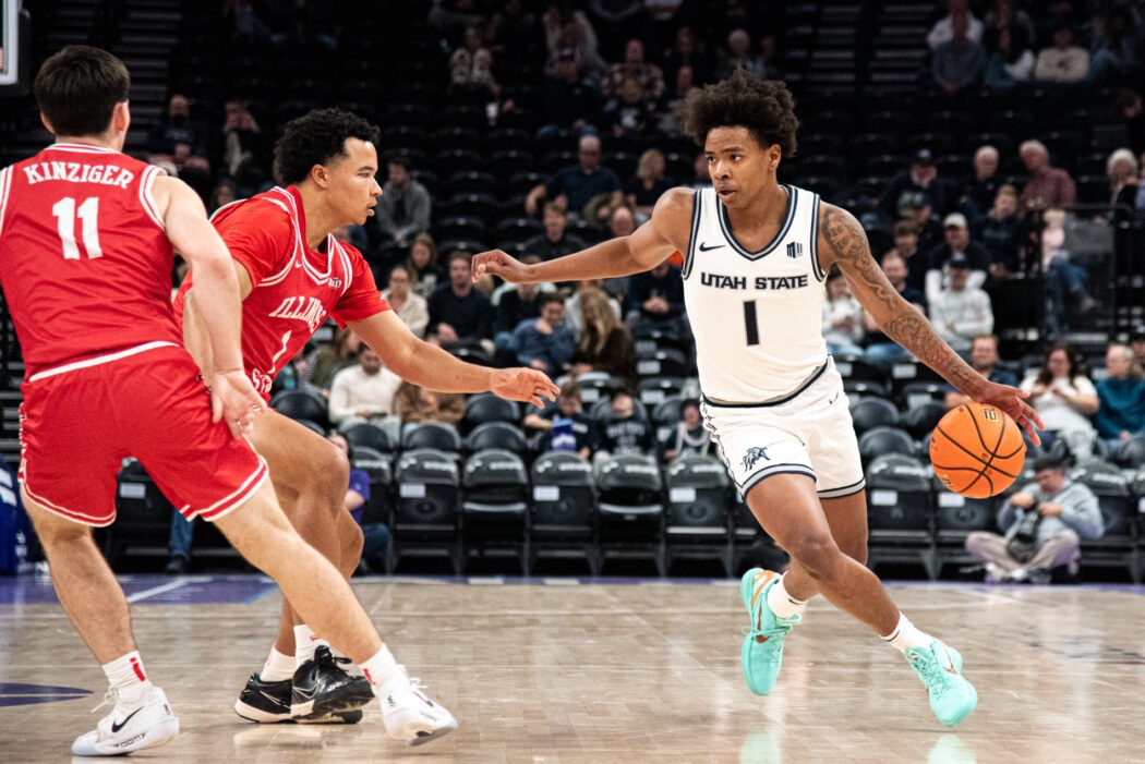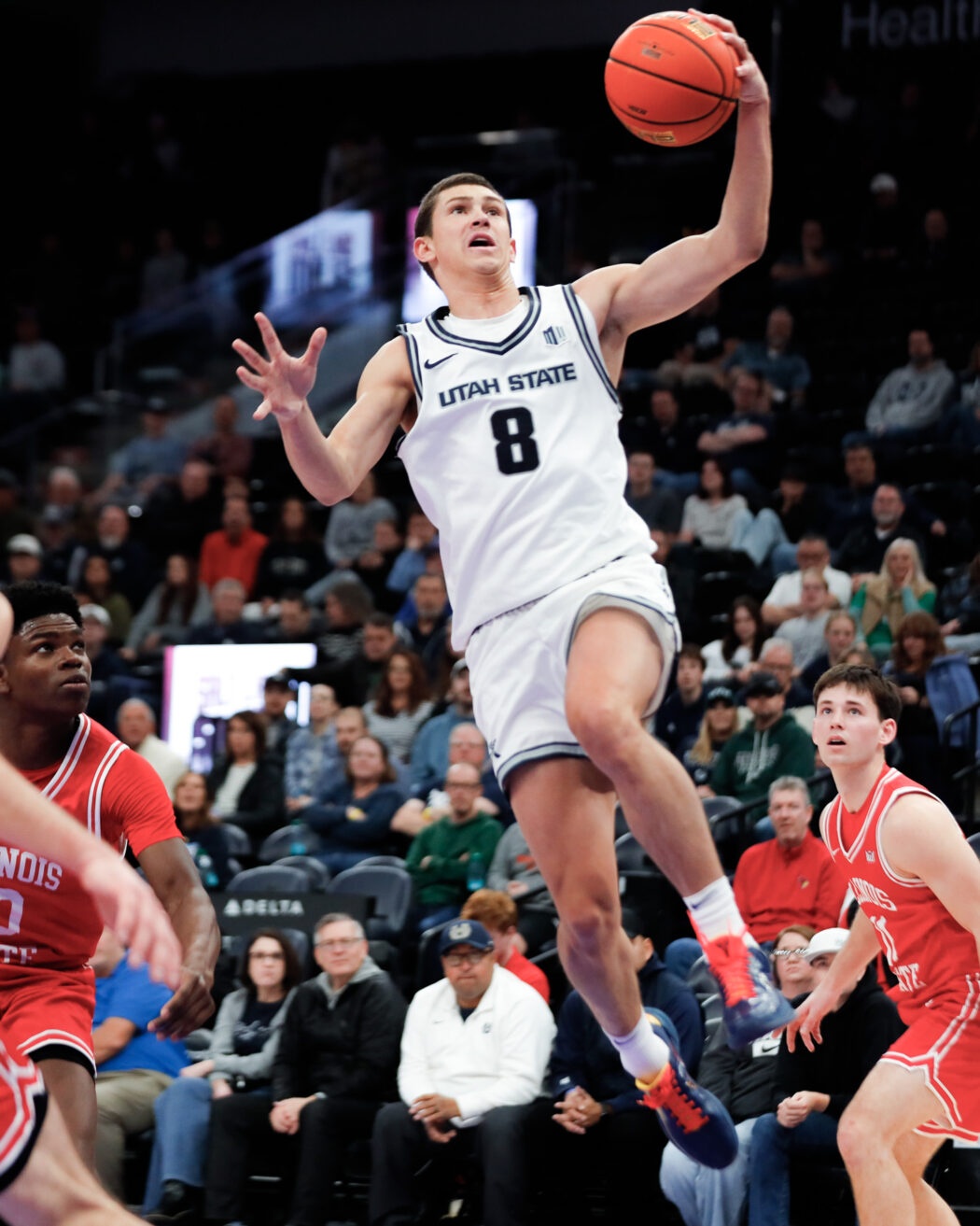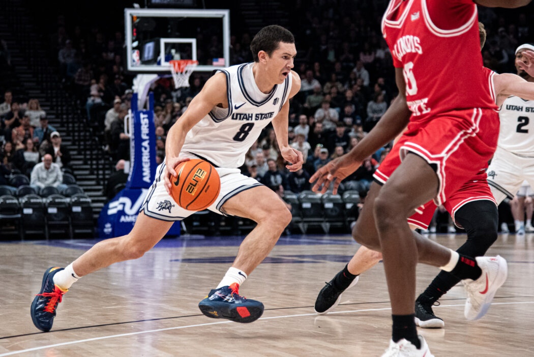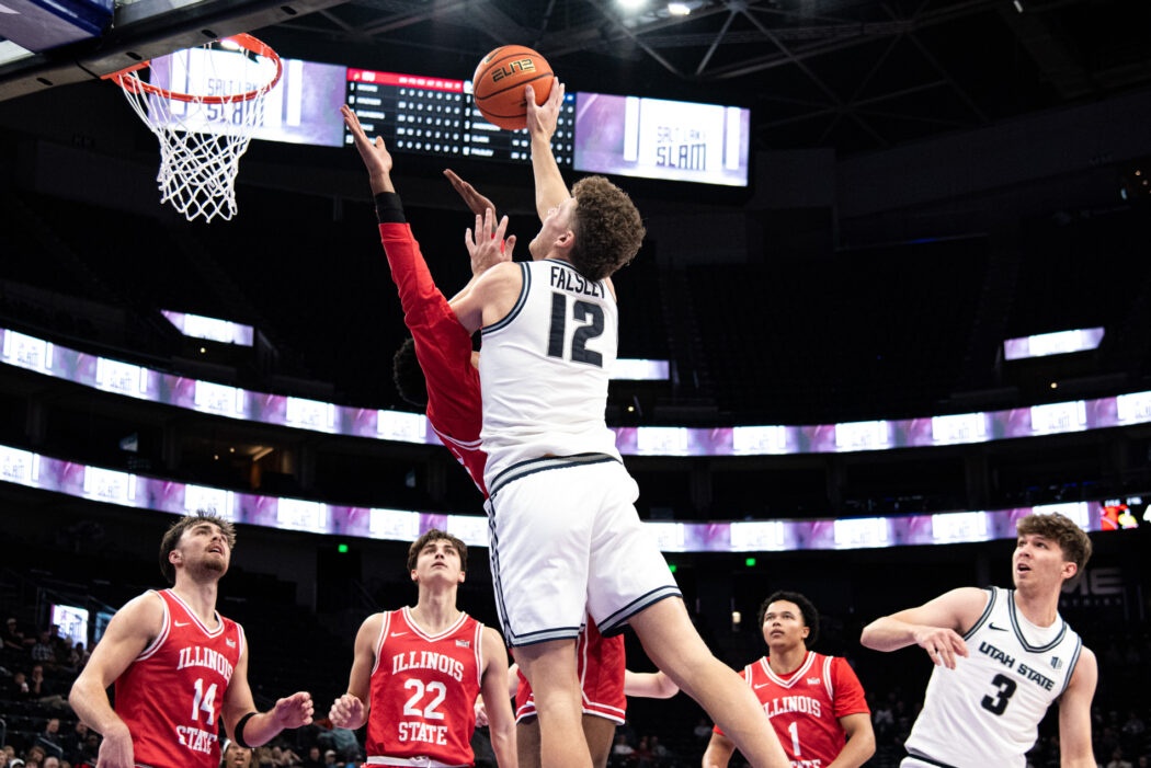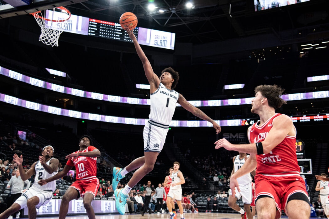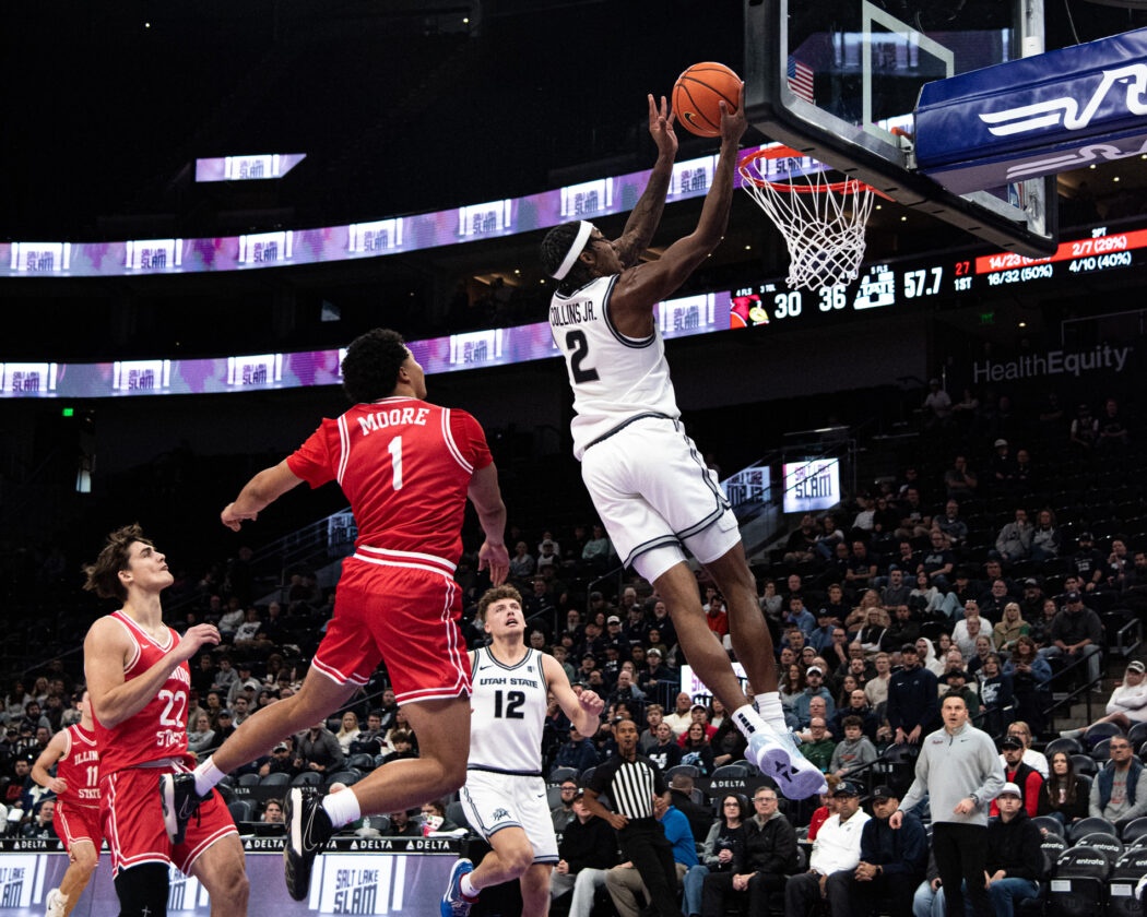USU Men’s Basketball plays against Illinois State at the Delta Center in Salt Lake City. The Aggies come out on top 83-78 by the end of the 4th quarter.