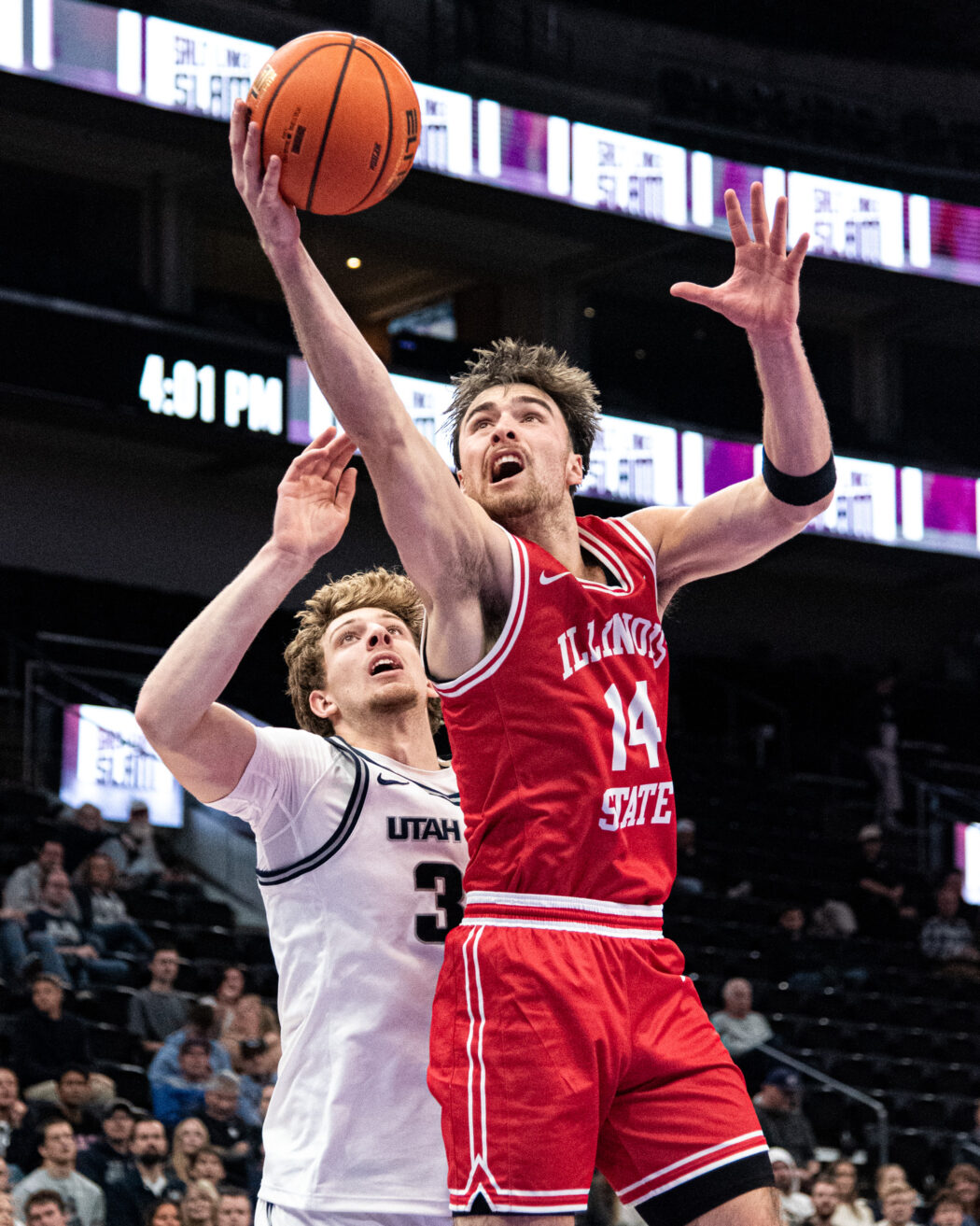 Mason Falslev, 12, is challenged at the hoop by an Illinois State defender at The Delta Center on Dec. 13.