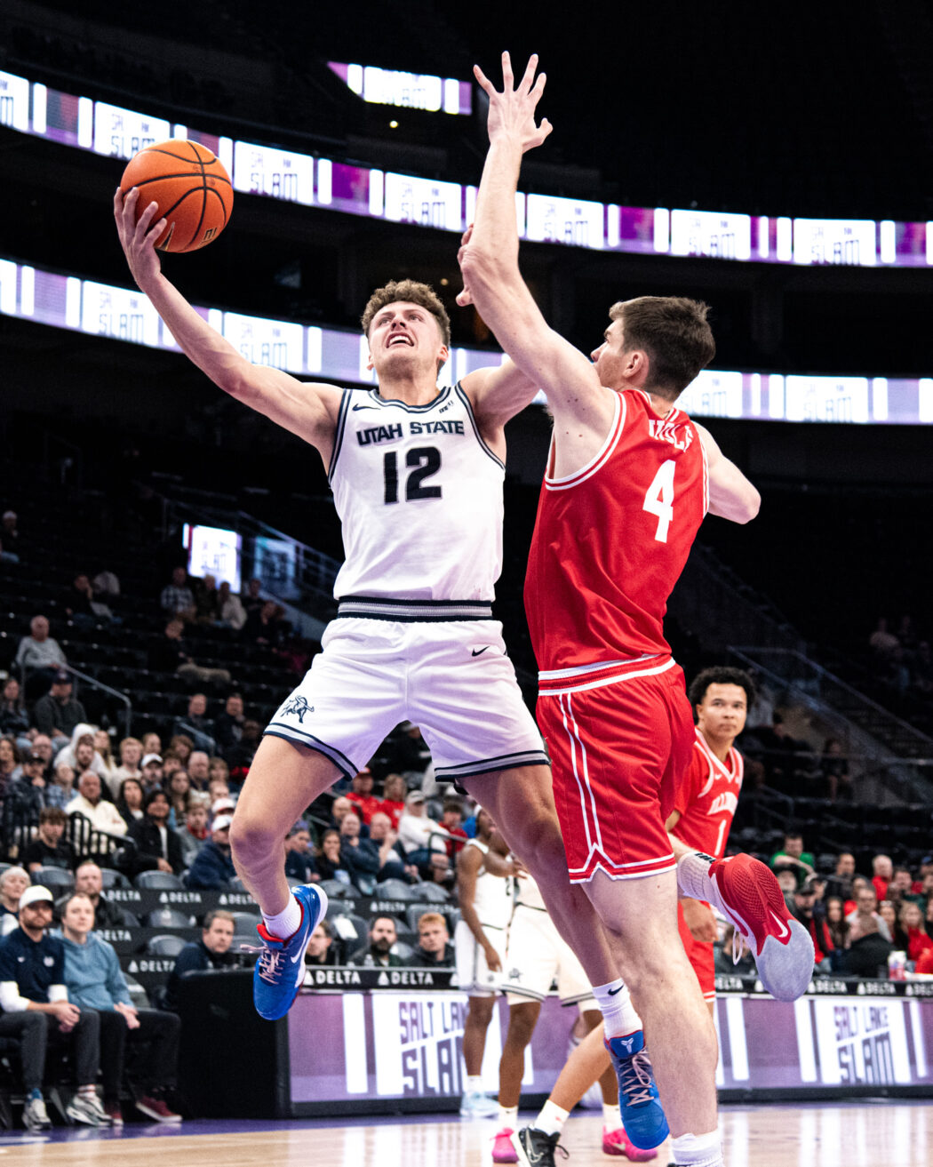 Mason Falslev, 12, scores a layup playing against Illinois State at The Delta Center on Dec. 13.