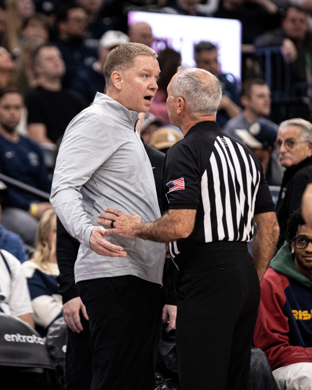 A referee talks to Head Coach Jerrod Calhoun at USU's basketball game against Illisnois State at The Delta Center on Dec. 13.