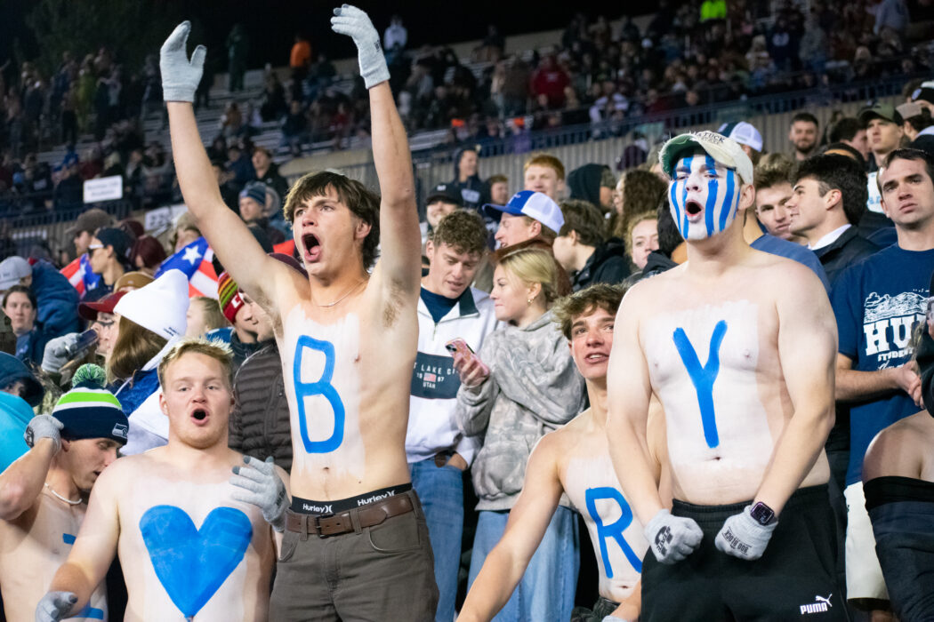 Aggies in the student section cheer on the football team during their game against Nevada at Maverik Stadium on Nov. 8.
