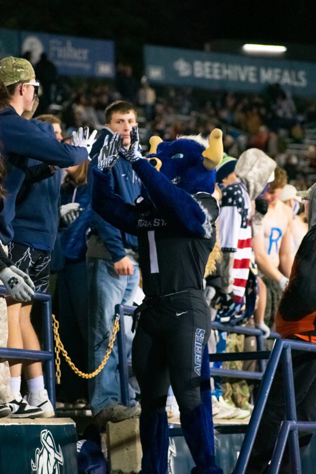 Big Blue high fives students during the football game against Nevada at Maverik Stadium on Nov. 8.