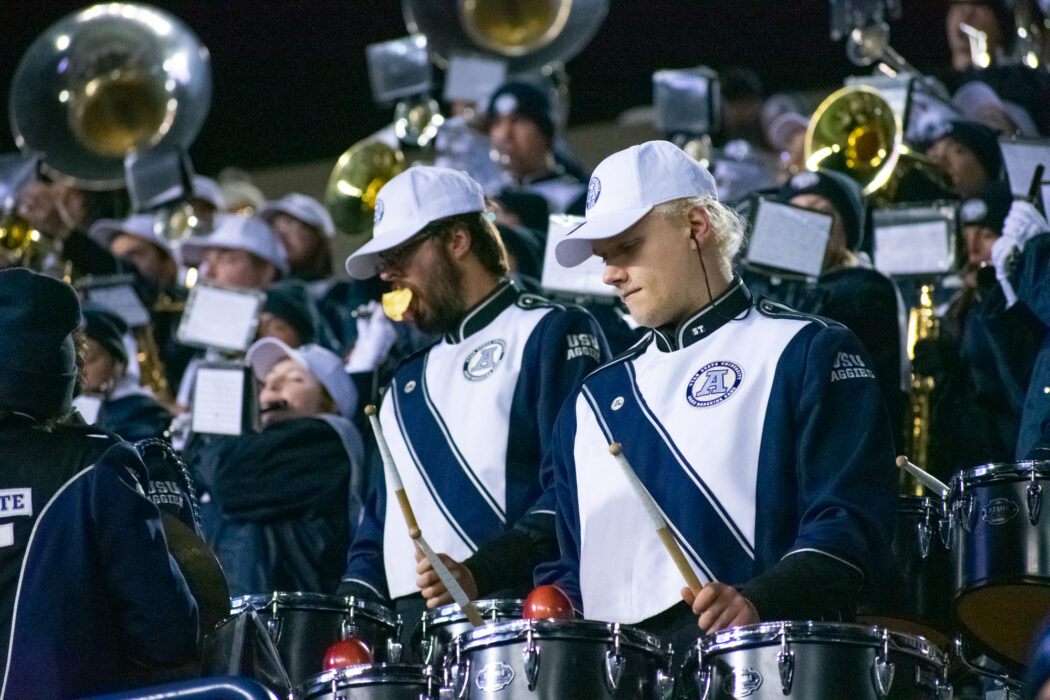 The Aggie Marching Band performs during the football game against Nevada at Maverik Stadium on Nov. 8.