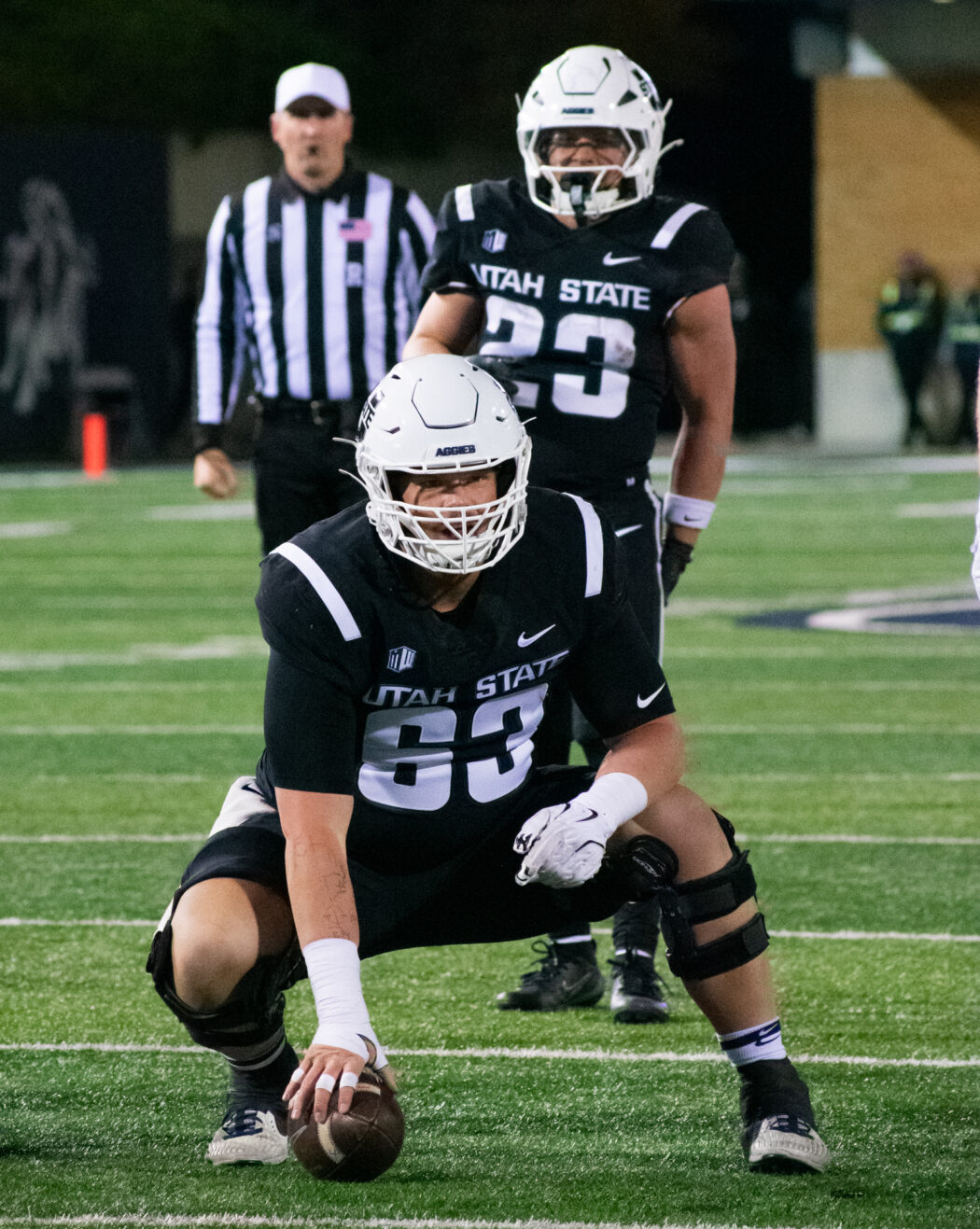 Jarvis Griffiths prepares for a play against Nevada at Maverik Stadium on Nov. 8.