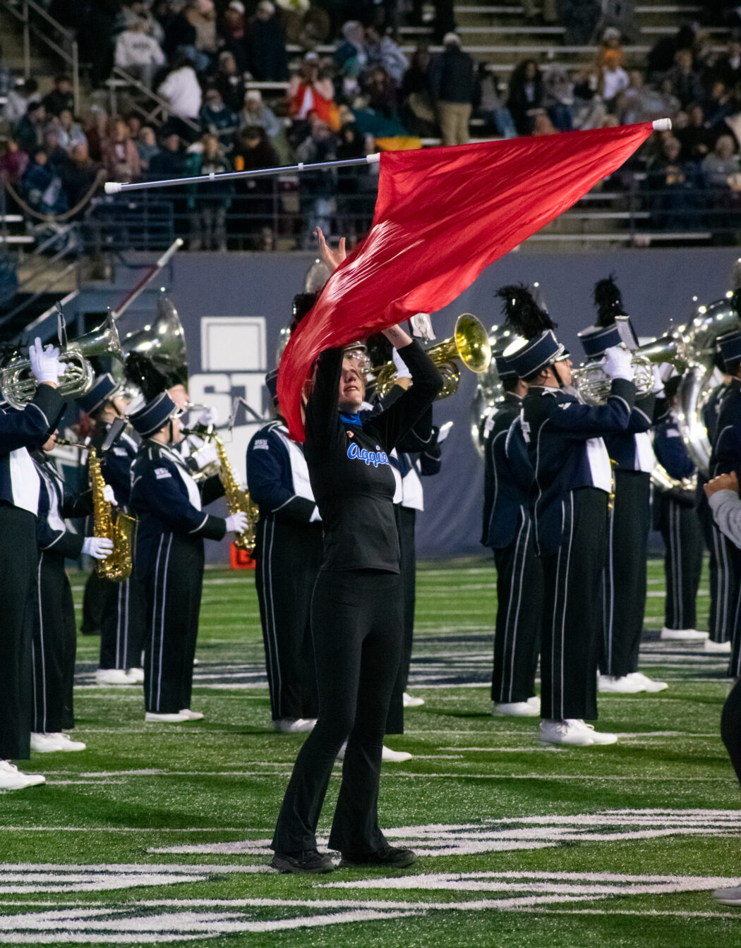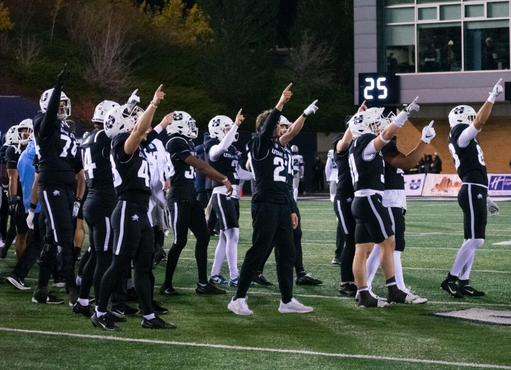 Members of the football team perform The Scotsman after their win against Nevada at Maverik Stadium on Nov. 8.