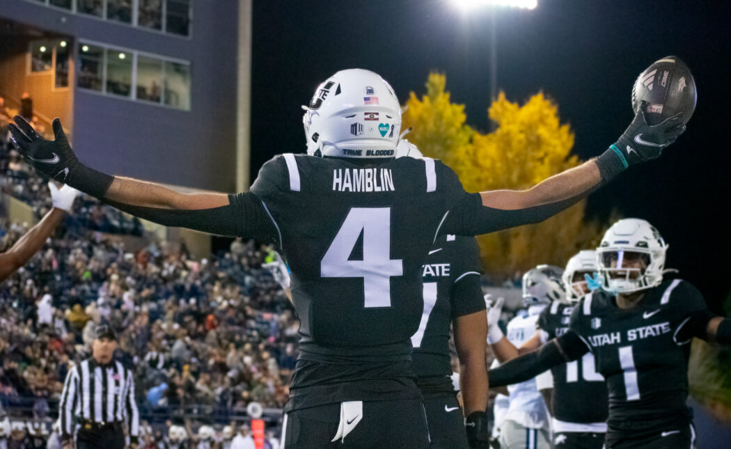 Brevin Hamblin celebrates a touchdown against Nevada on Nov. 8 at Maverik Stadium.