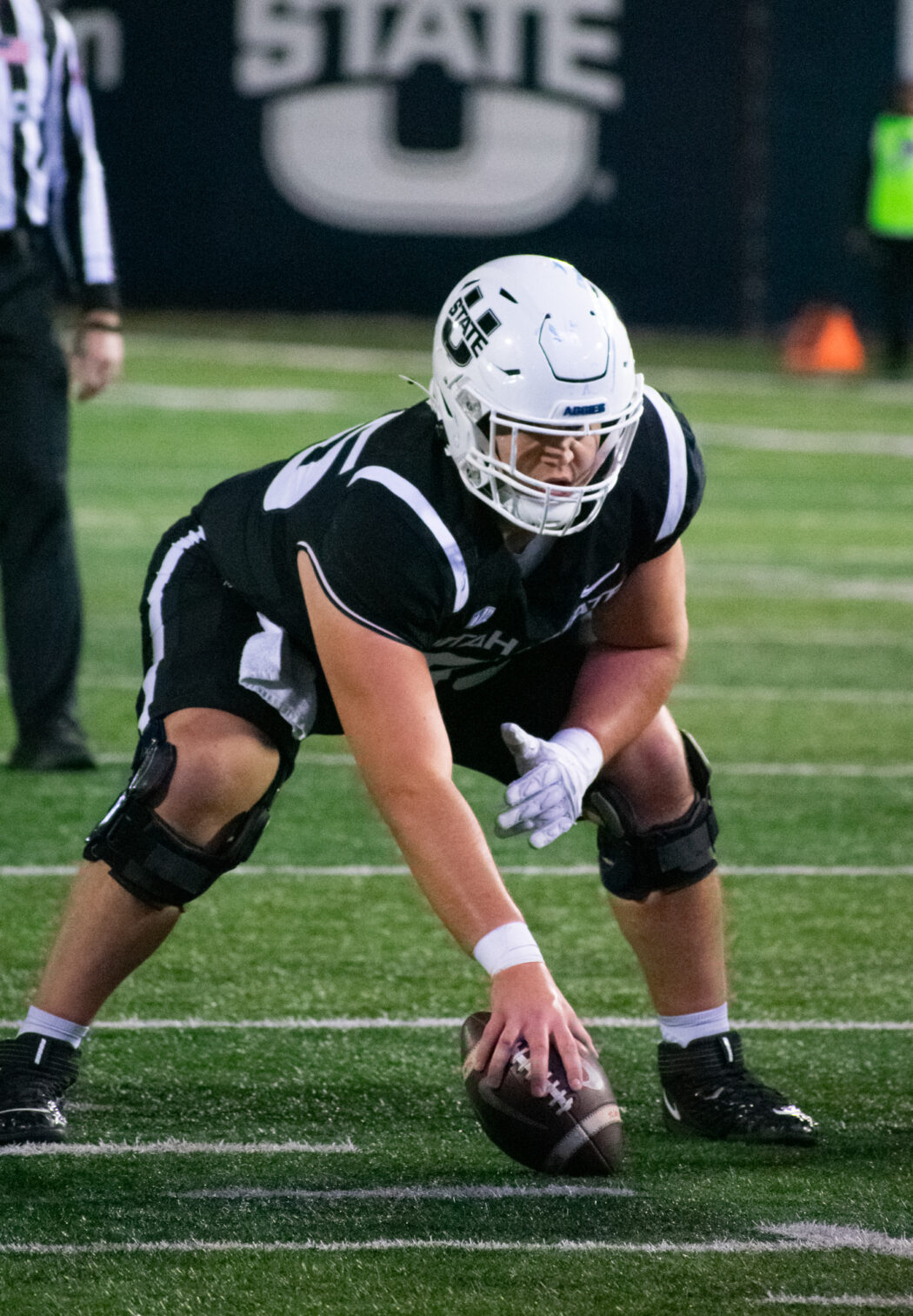 Tevita Tuha prepares to hike the ball during a game against Nevada on Nov. 8 at Maverik Stadium.