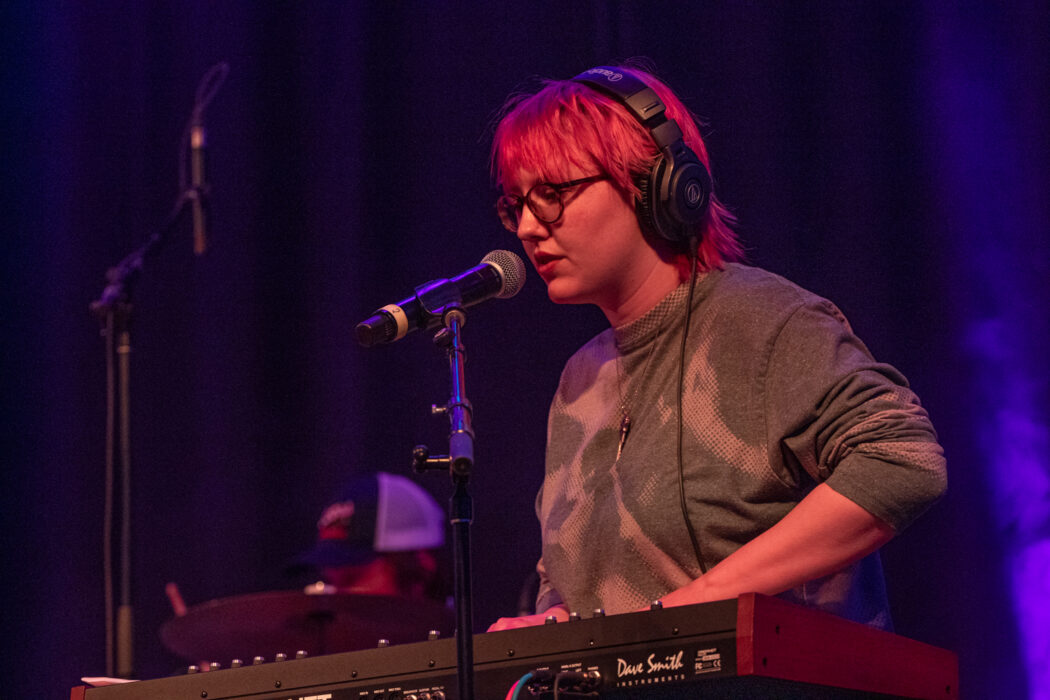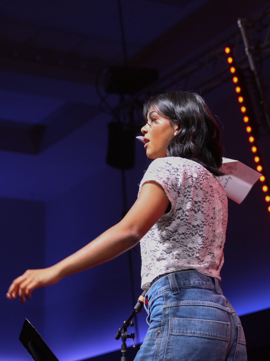 Swetha Bharat tosses her setlist folded into a paper airplane into the crowd after her End of Year Bash performance on April 11.