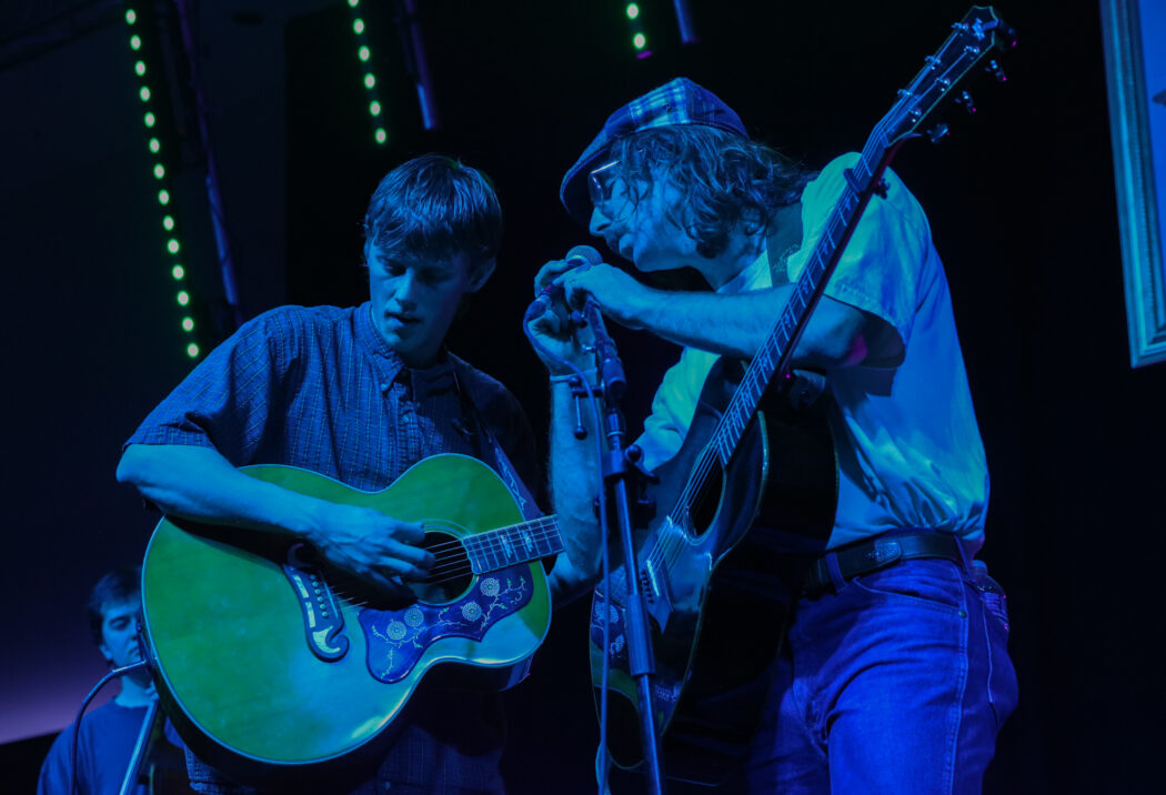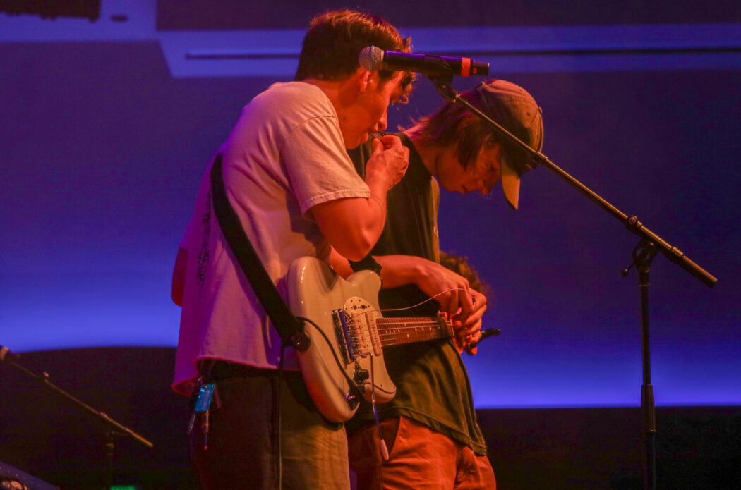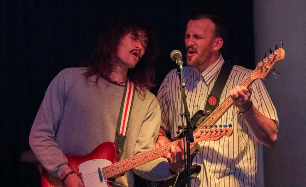 Sunhills band members, Cameron Zitting, lead guitar and sound engineer, and Drew Nicholson, guitarist and lead vocalist, change a string on Nicholson’s guitar mid-set on April 11.