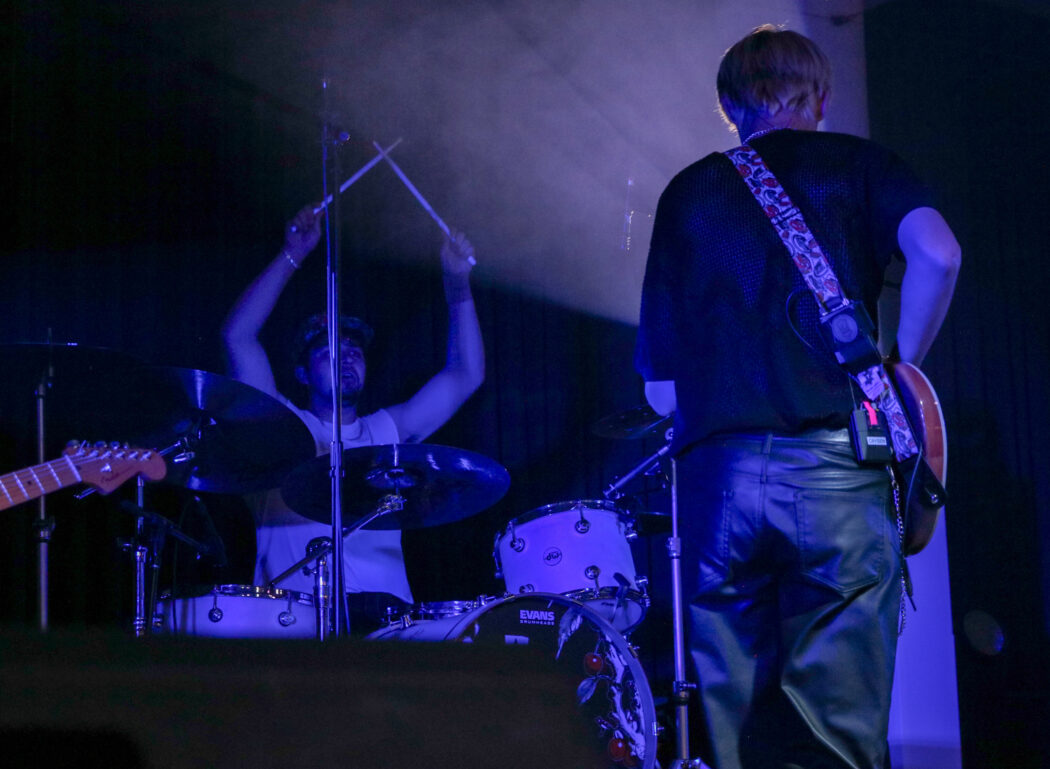 Last Wild Buffalo band member, Jonny Celaya plays guitar as Isaac Woodruff, vocalist and guitarist for the band, whistles during their encore performance at the End of Year Bash on April 11.