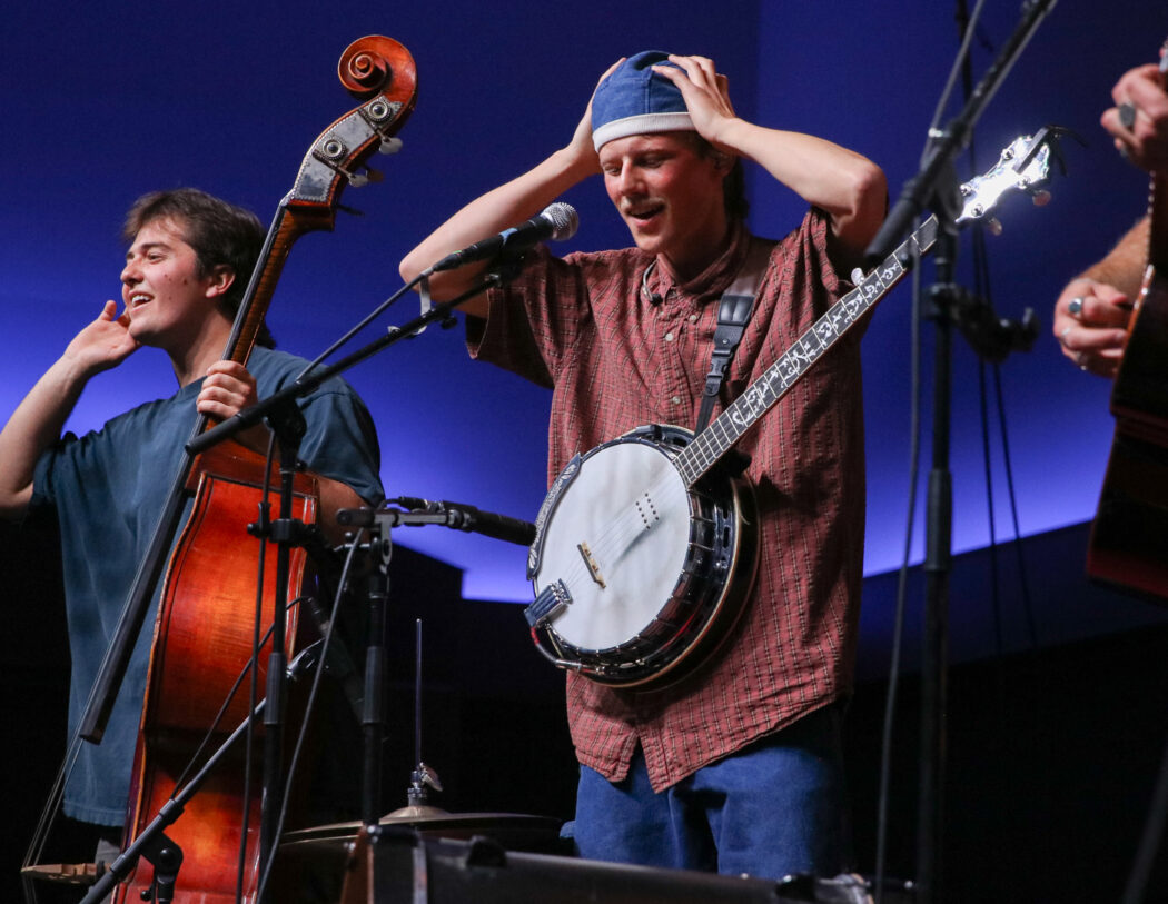 Jonny Celaya, Last Wild Buffalo vocalist and banjoist, puts on a hat thrown to him at the End of Year Bash on April 11.