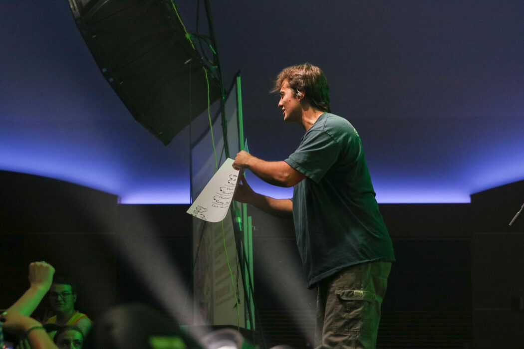 Troy Lybbert, Last Wild Buffalo stand up bassist, prepares to throw the setlist into the crowd at the End of Year Bash on April 11.
