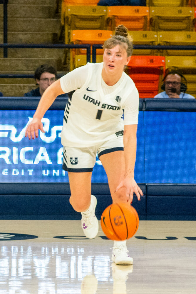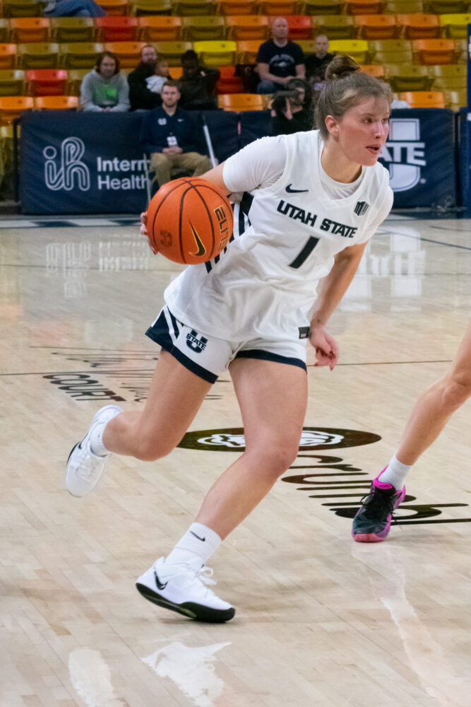 USU guard Marina Asensio is dribbles during the USU vs Idaho women’s basketball game in the Dee Glen Smith Spectrum on Dec. 13, 2025. (Dane Johnson/The Utah Statesman)