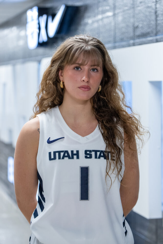 Senior guard for USU women’s basketball Marina Asensio poses for a photo in the Dee Glen Smith Spectrum in Logan, Utah on Dec. 15, 2025. (Dane Johnson/The Utah Statesman)