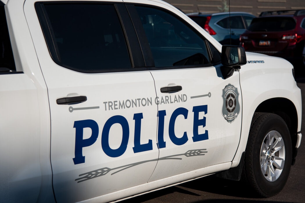 A Tremonton-Garland police department truck sits outside the Dee Glen Smith Spectrum on Aug 29 before the funeral of Tremonton-Garland Sgt. Lee Sorensen.