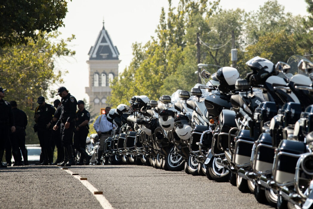 Police motorcycles line 800 E. past the Dee Glen Smith Spectrum for the funeral of Tremonton-Garland Sgt. Lee Sorensen on Aug 29.
