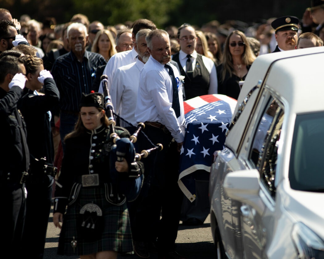 Bagpipes lead the funeral procession in and out of the Dee Glen Smith Spectrum for the funeral of Tremonton-Garland Sgt. Lee Sorensen on Aug 29.