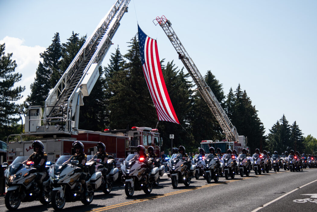 Police motorcycles lead the funeral procession of Tremonton-Garland Sgt. Lee Sorensen from the Dee Glen Smith Spectrum on Aug 29.