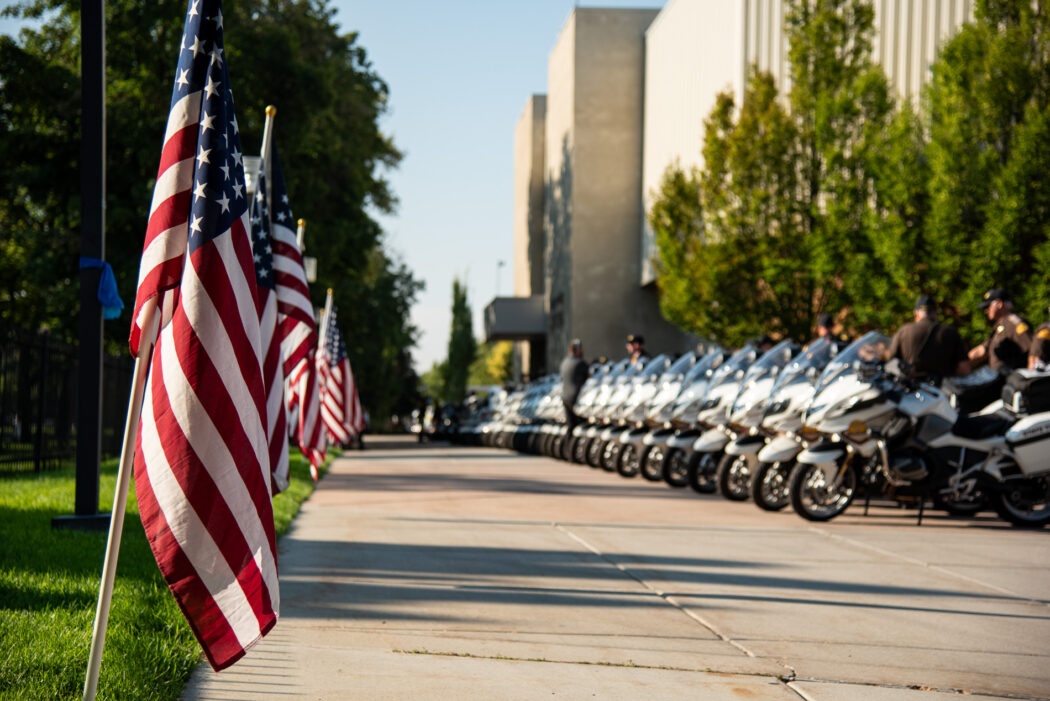 Flags and motorcycles surround the Dee Glen Smith Spectrum on Aug 29 during the funeral of Tremonton-Garland Sgt. Lee Sorensen.