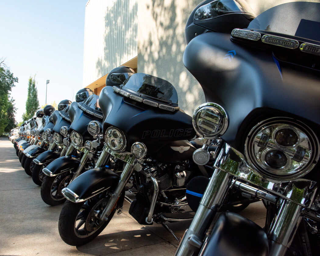 Police motorcycles surround the Dee Glen Smith Spectrum during the funeral of Tremonton-Garland Sgt. Lee Sorensen on Aug 29.