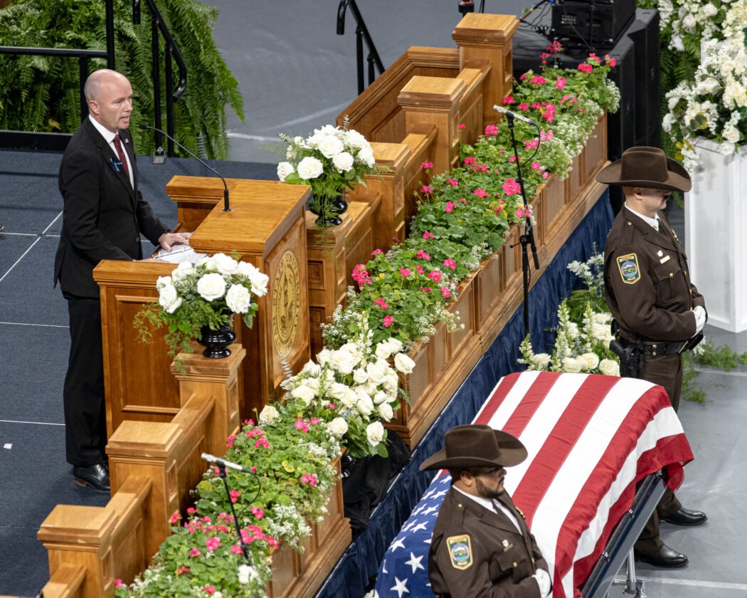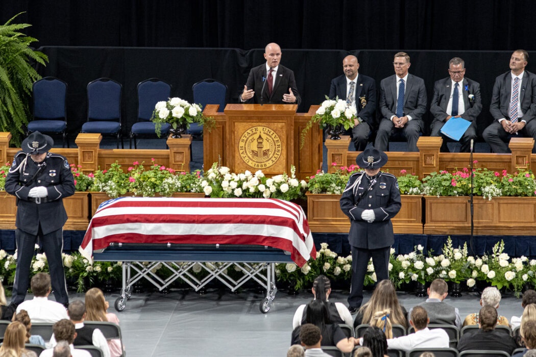 Utah Governor Spencer Cox speaks at the funeral of Tremonton-Garland Sgt. Lee Sorensen on Aug 29 in the Dee Glen Smith Spectrum.