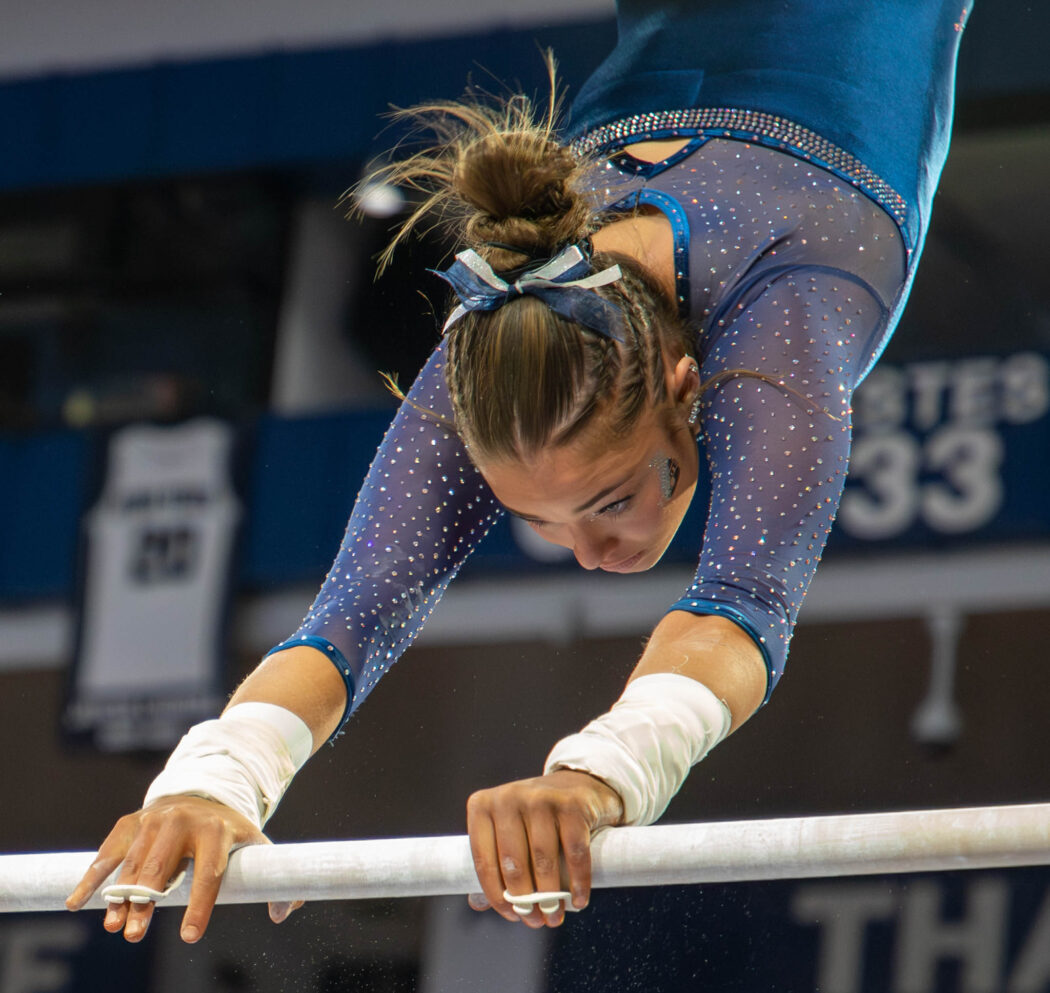 A Utah State gymnast competes on the uneven bars during a gymnastics meet Jan. 23 at the Spectrum. Photo by Alyssa Cook