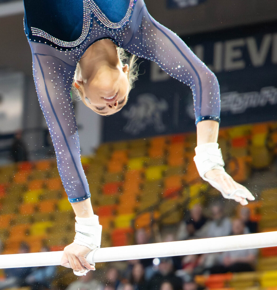 Isabella Vater competes on the uneven bars during gymnastics meet Jan. 23, in the Spectrum. Photo by: Alyssa Cook
