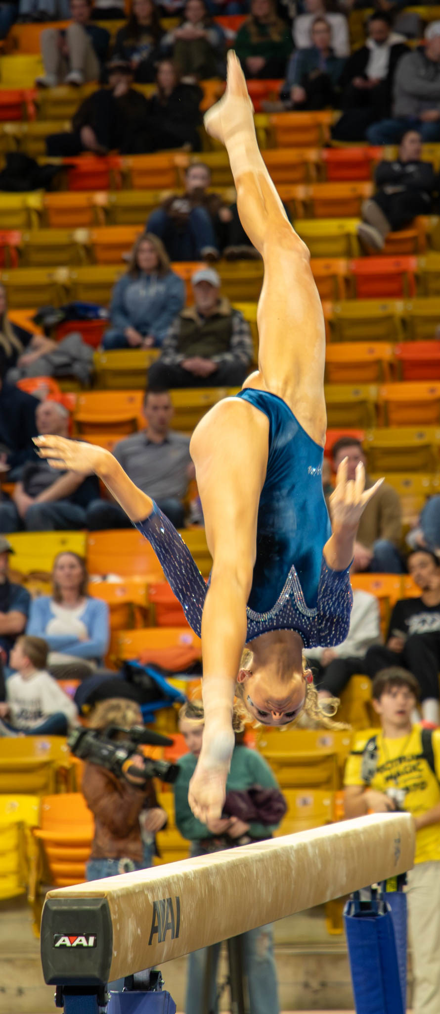 In the Spectrum Isabella Vater, flips upside down on the beam during gymnastics meet Jan. 23. Photo by: Alyssa Cook