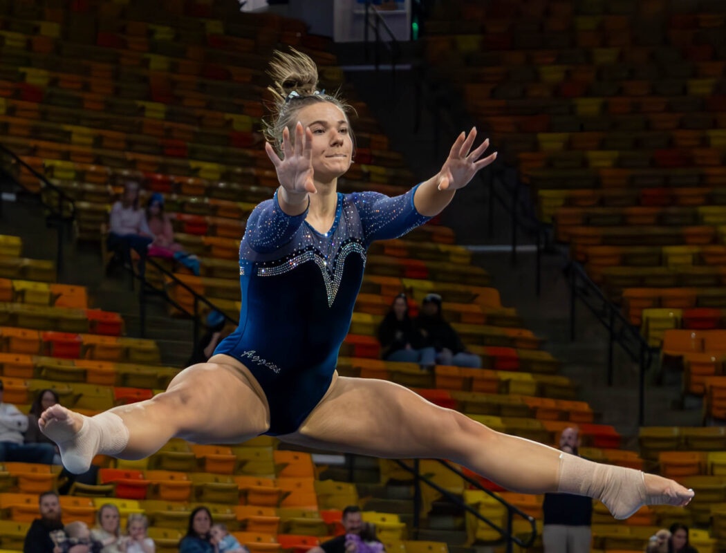 Kaylie Medrano leaps in the air during gymnastics meet Jan. 23, in the Spectrum. Photo by: Alyssa Cook