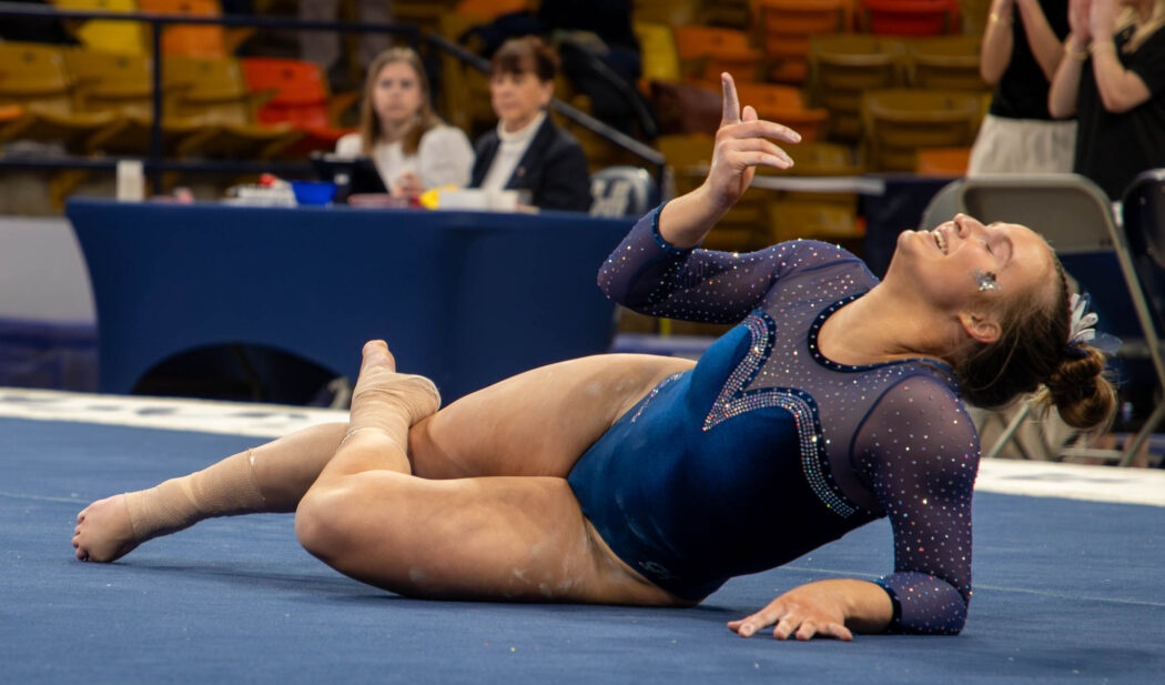 Anabelle Dewey poses at the end of her floor routine Jan. 23 in the Spectrum. Photo by: Alyssa Cook