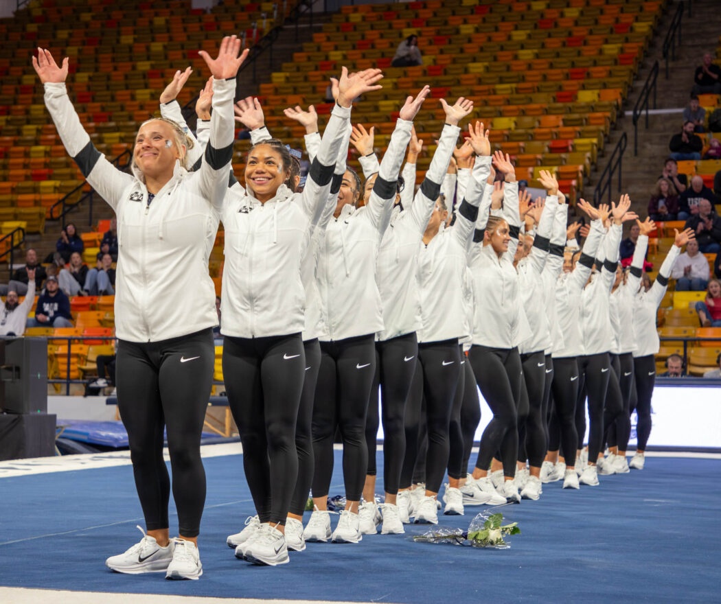 The gymnastics team waves as their win is announced Jan. 23 in the spectrum. Photo by: Alyssa Cook