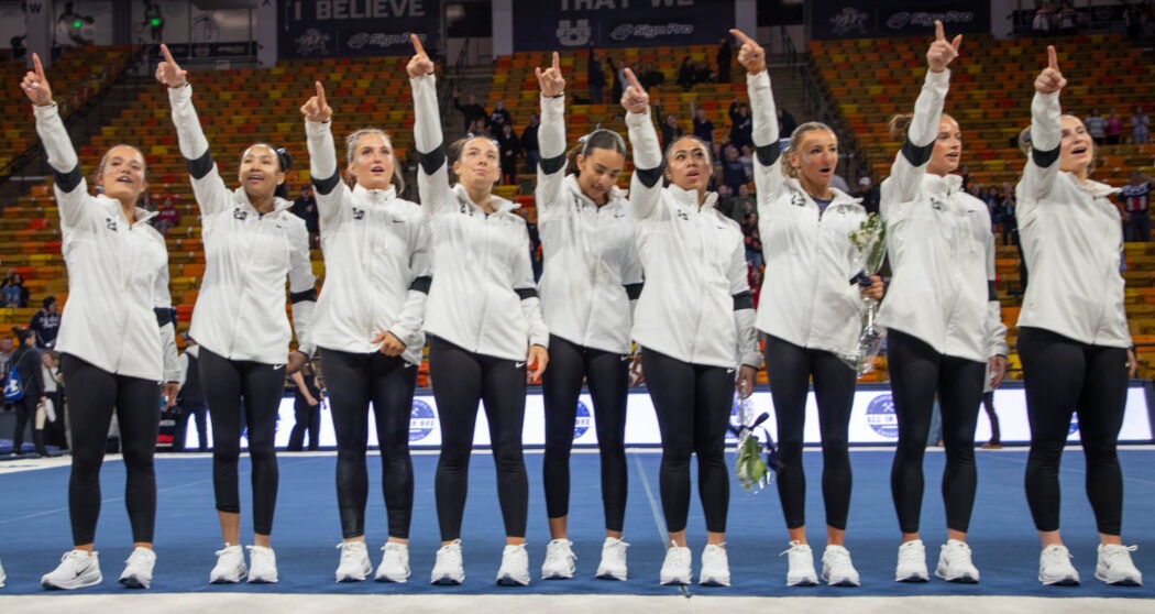 The gymnastics team does the Scotsman after their win over San Jose State, Jan. 23 in the spectrum. Photo by: Alyssa Cook