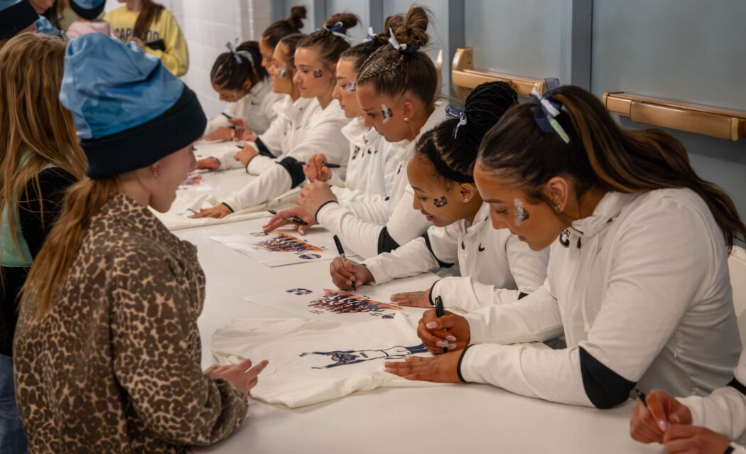 The gymnastics team signs posters after their meet Jan. 23. Photo by: Alyssa Cook