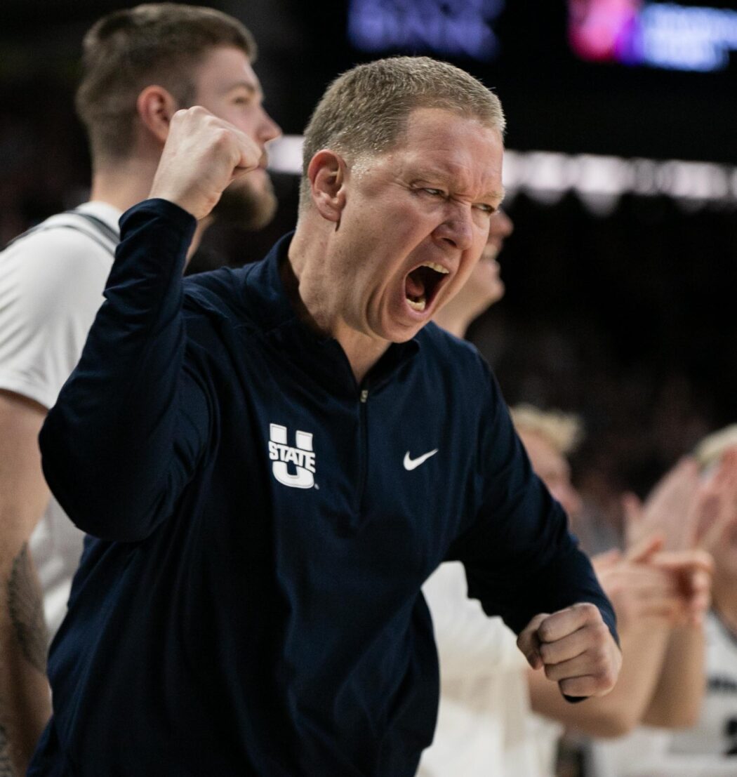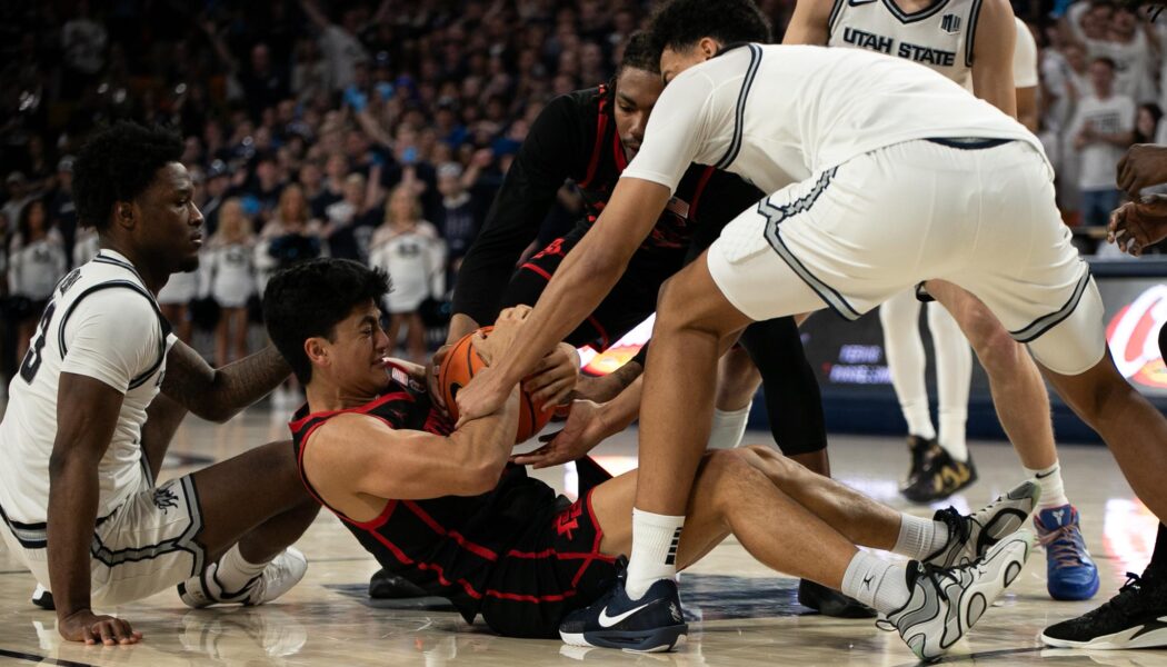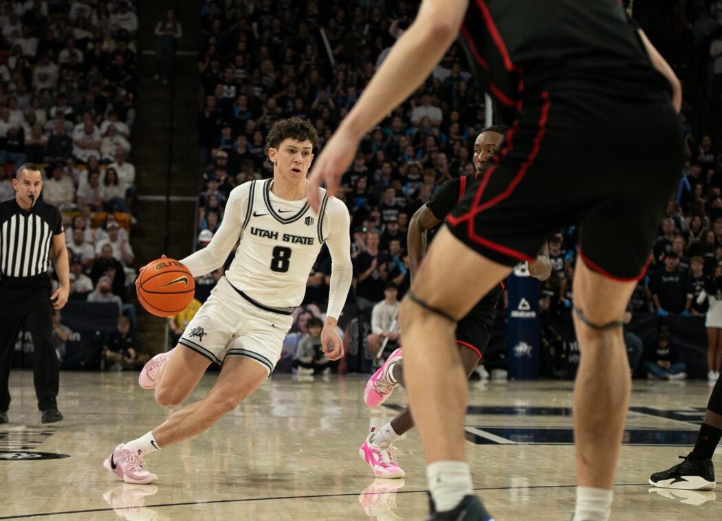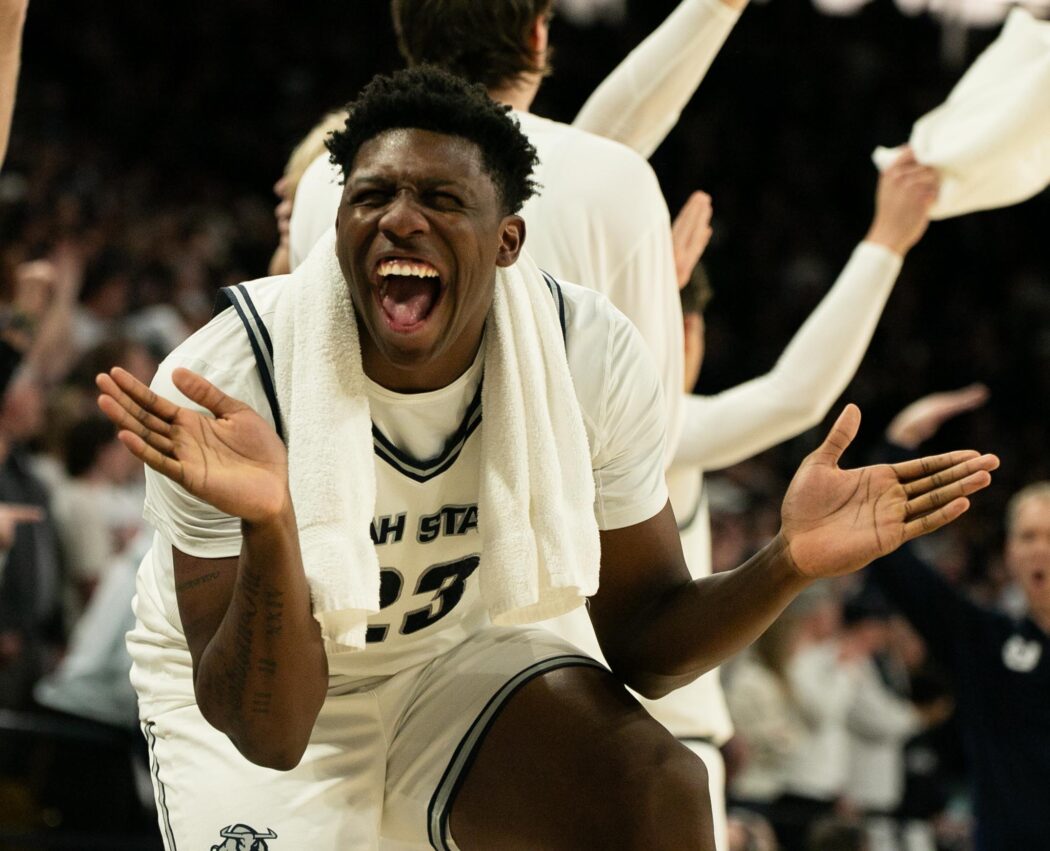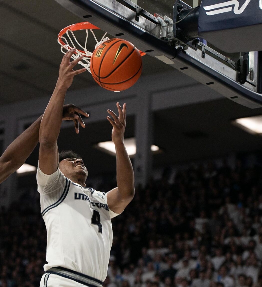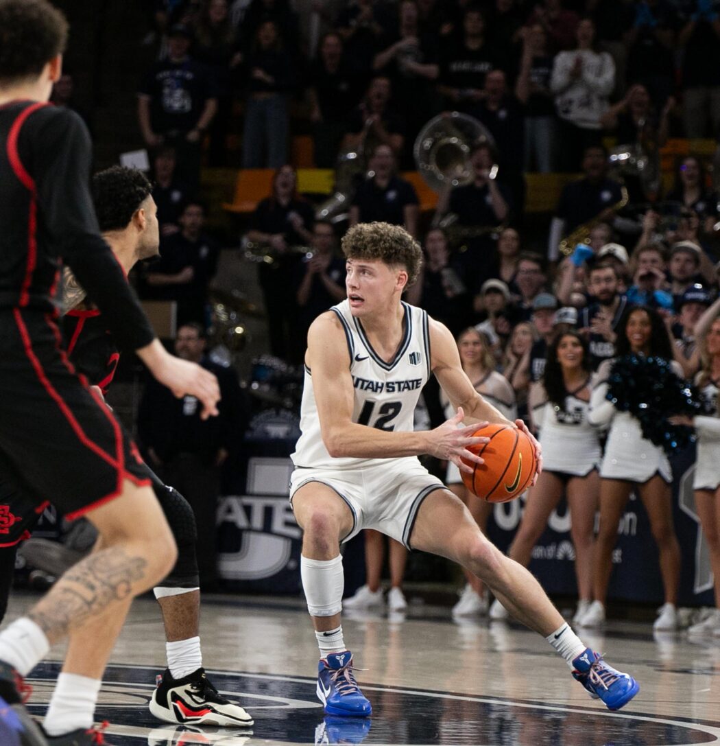 Men’s basketball beat San Diego State University in a tight game. Final score USU 79 – SDSU 71.