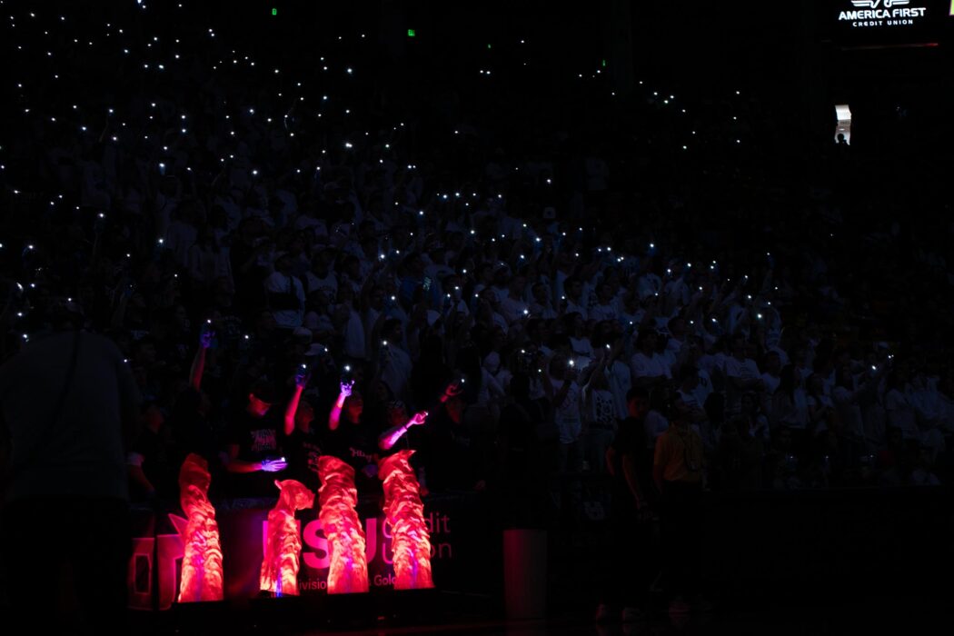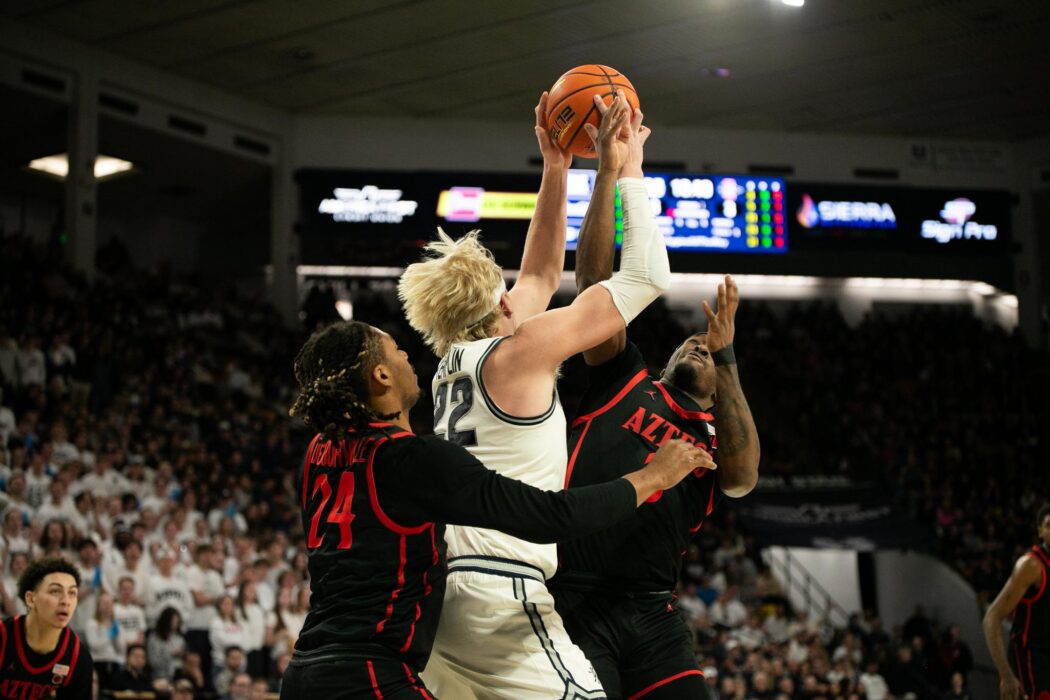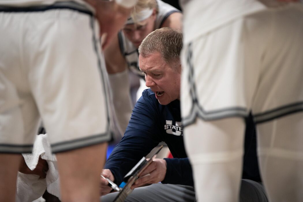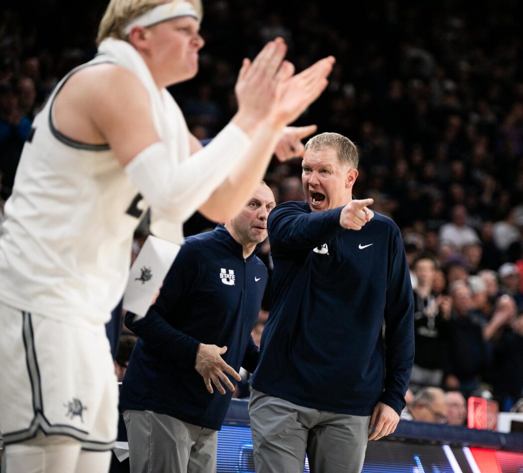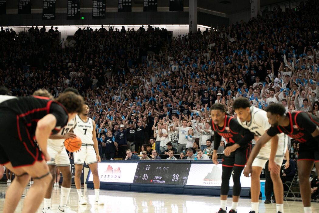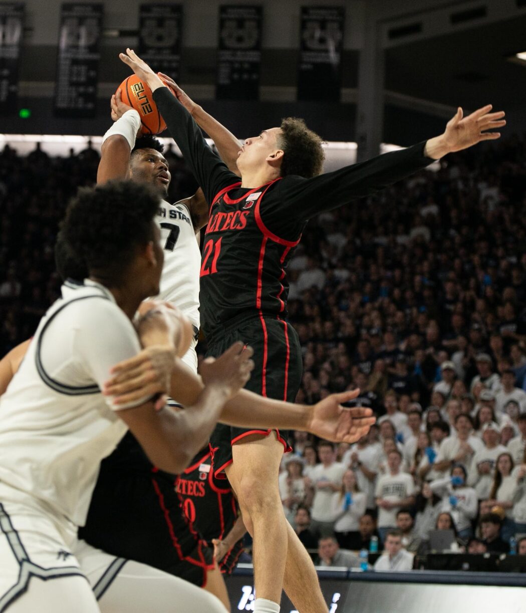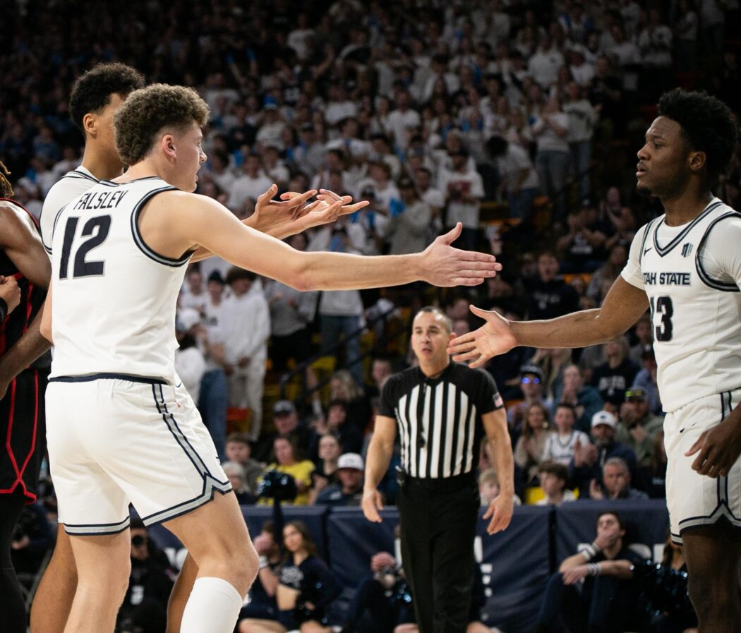 Men’s basketball beat San Diego State University in a tight game. Final score USU 79 – SDSU 71.