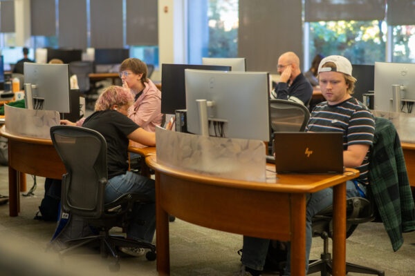 People sit at computers on the first floor of the Merrill-Cazier Library in Logan, Utah on Oct. 21, 2025. (Dane Johnson//The Utah Statesman)