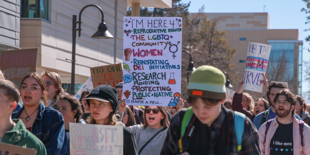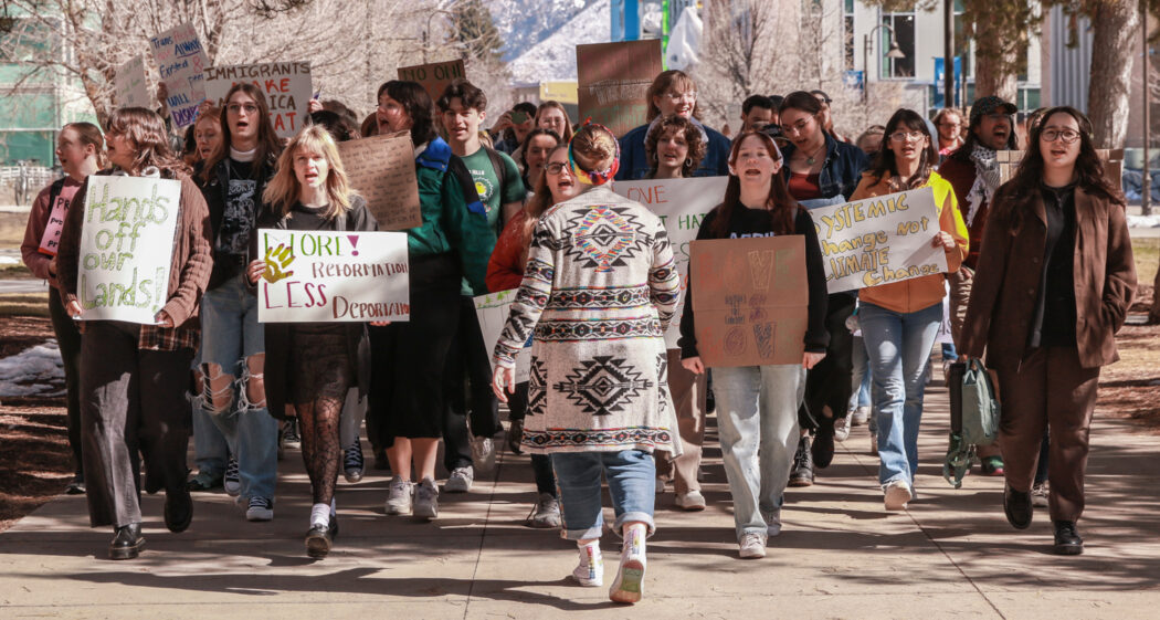 Rally for Rights participants chant and march through USU campus on Feb. 28.