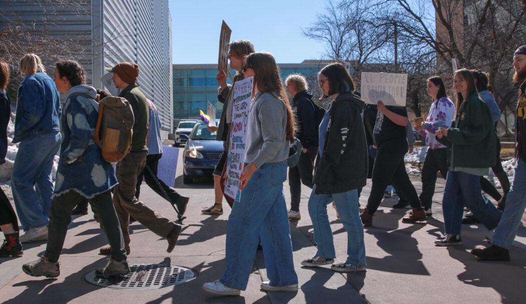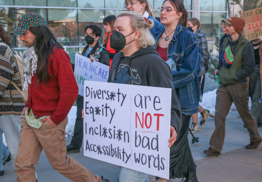 Rally for Rights participants march through the middle of campus close to the TSC on Feb. 28.