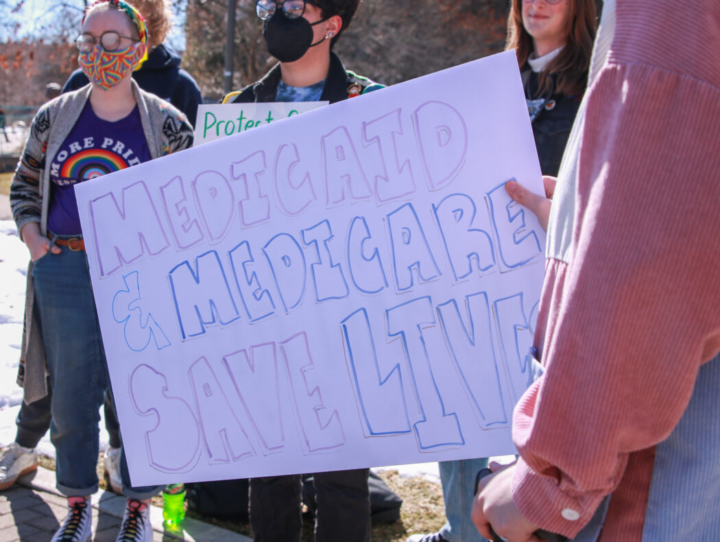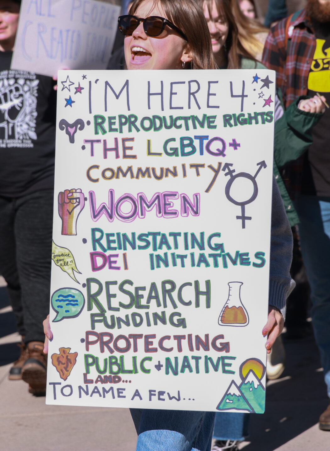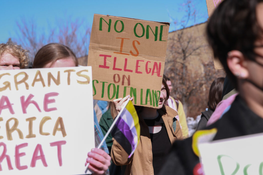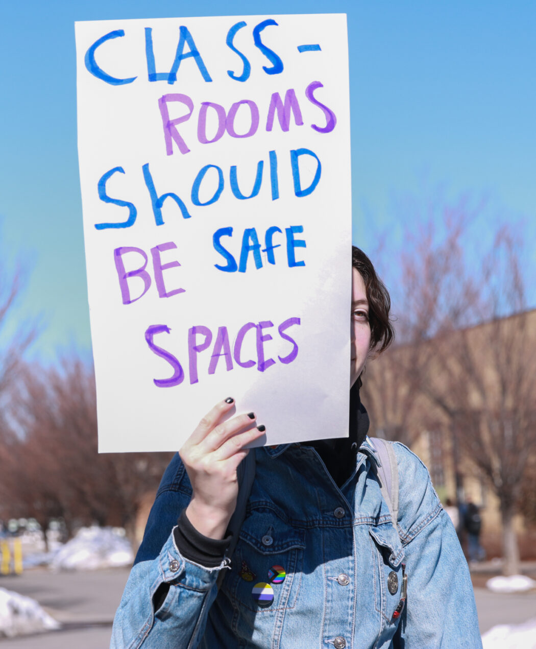 Rally for Rights participant holds a sign while someone speaks on Feb. 28.