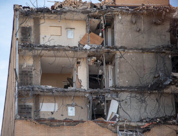 Pieces of Mountain View Tower is torn off the side of the building during it’s demolition on Dec. 11, 2025. Photo by Jack Burton