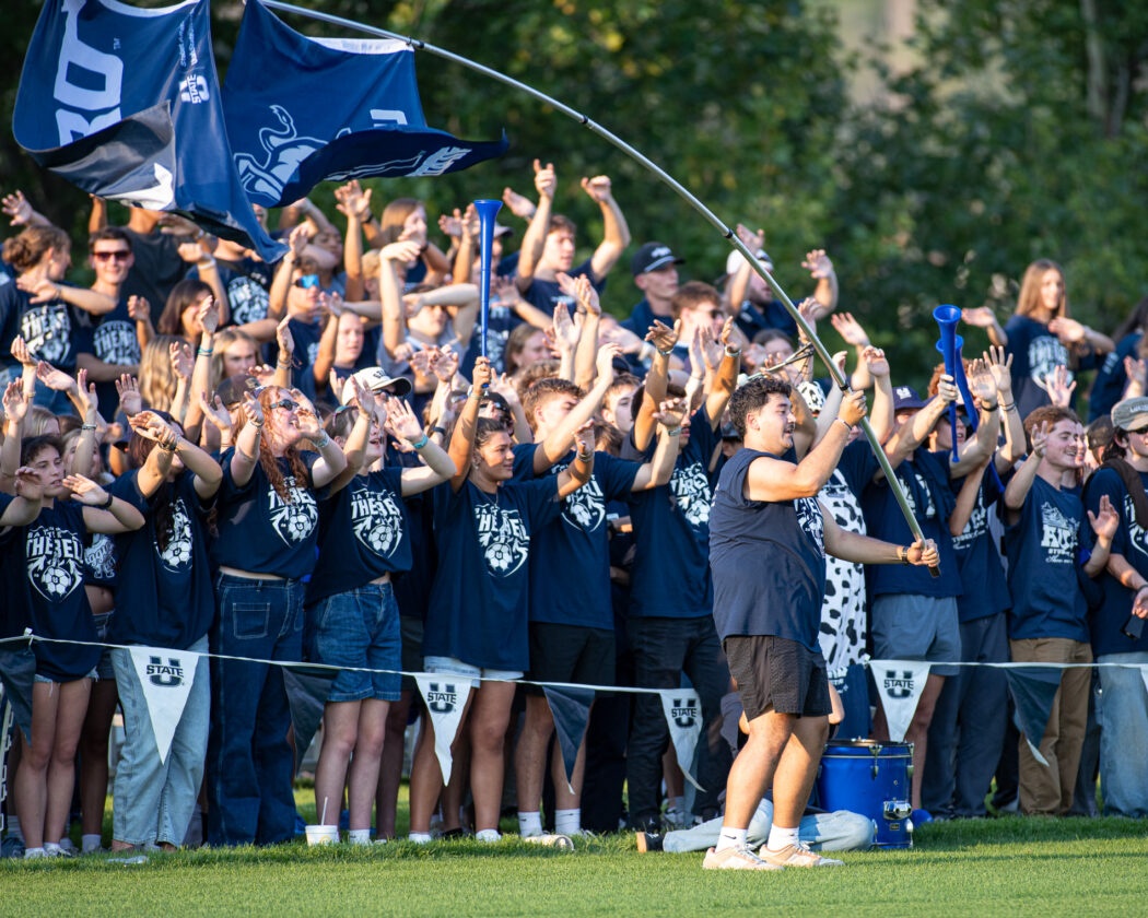 Ben Burdette, Athletics & Campus Recreation Executive Director, waves Utah State themed flags in front of the student section at the Women's Soccer Vs Utah game on Aug 28 at Chuck & Gloria Bell Field.