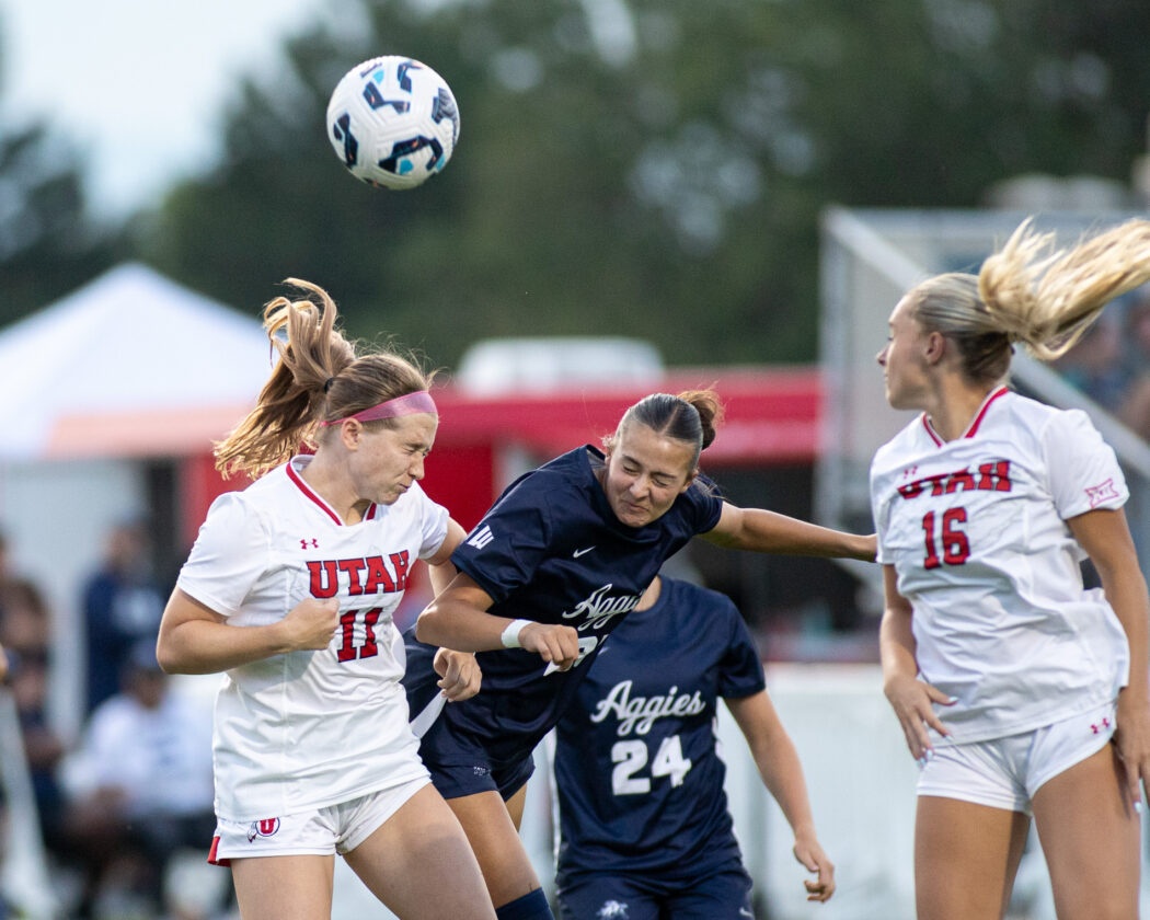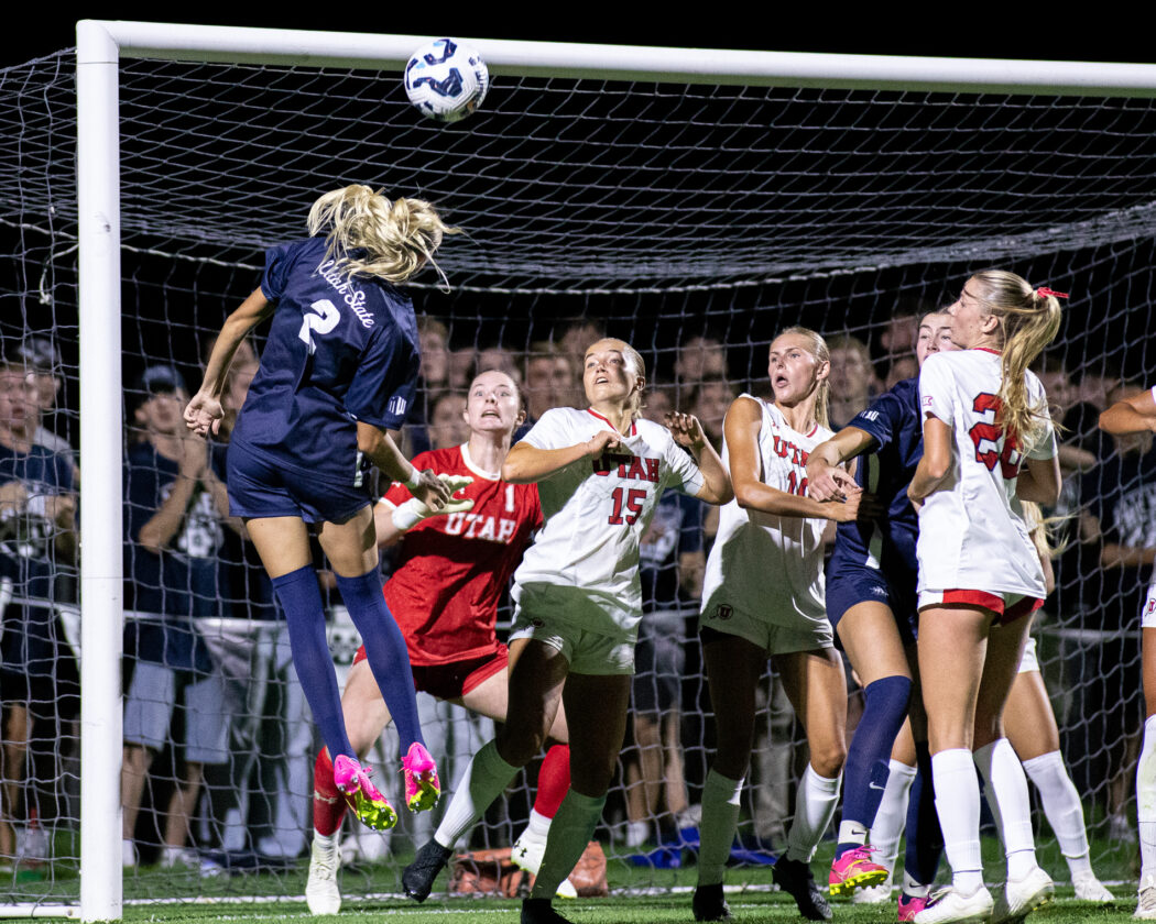 USU and Utah players jump into each other as they try to make contact with the ball from a corner kick at Chuck & Gloria Bell Field on Aug 28.