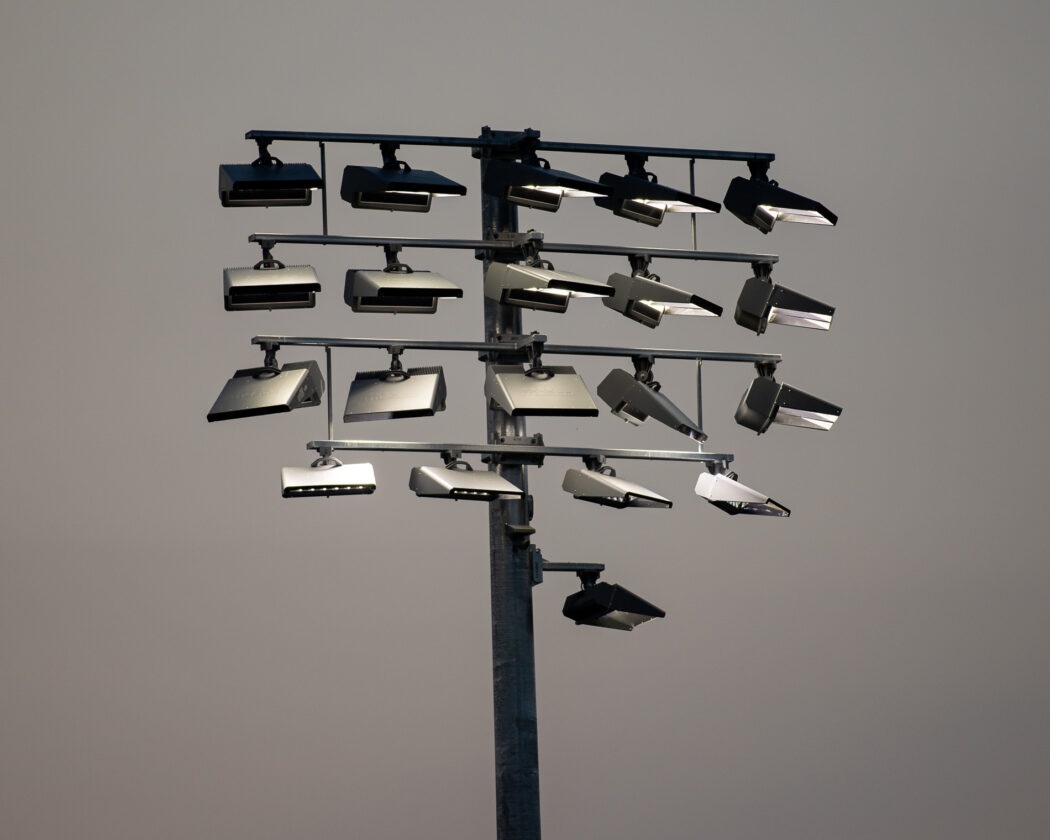 The new lights of Chuck & Gloria Bell Field flash over the field at the beginning of the second half on Aug 28.