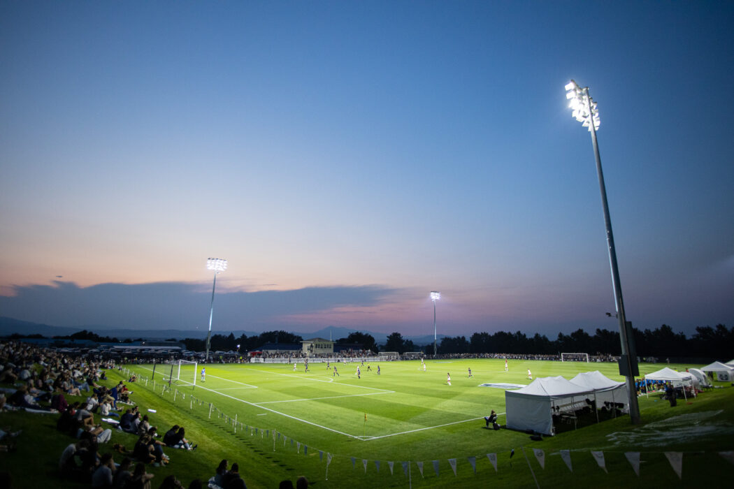 USU Women's Soccer battles Utah under the lights of Chuck & Gloria Bell Field as the sun sets behind clouds in the west on Aug 28.